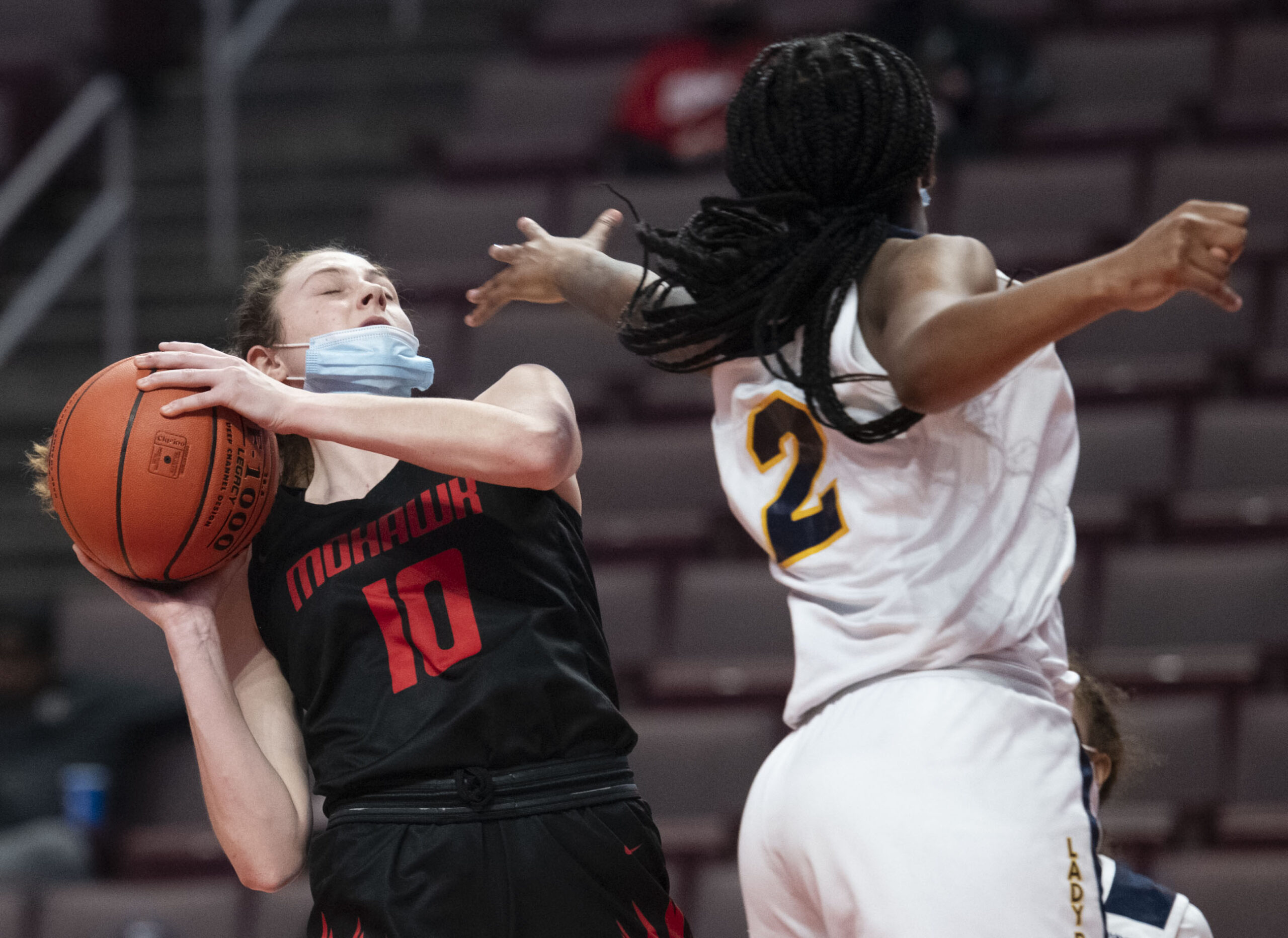 3AGirlsChampionship March 25, 2021 • 2560 × 1864 • Week in Photos: March 21-27 Mohawk’s Paige Julian leans back as West Catholic’s Destiney McPhaul tries to block her during the PIAA 3A championship game on Thursday, March 25, 2021, at Giant Center in Hershey. Mohawk lost 56-67. (Emily Matthews/Post-Gazette)