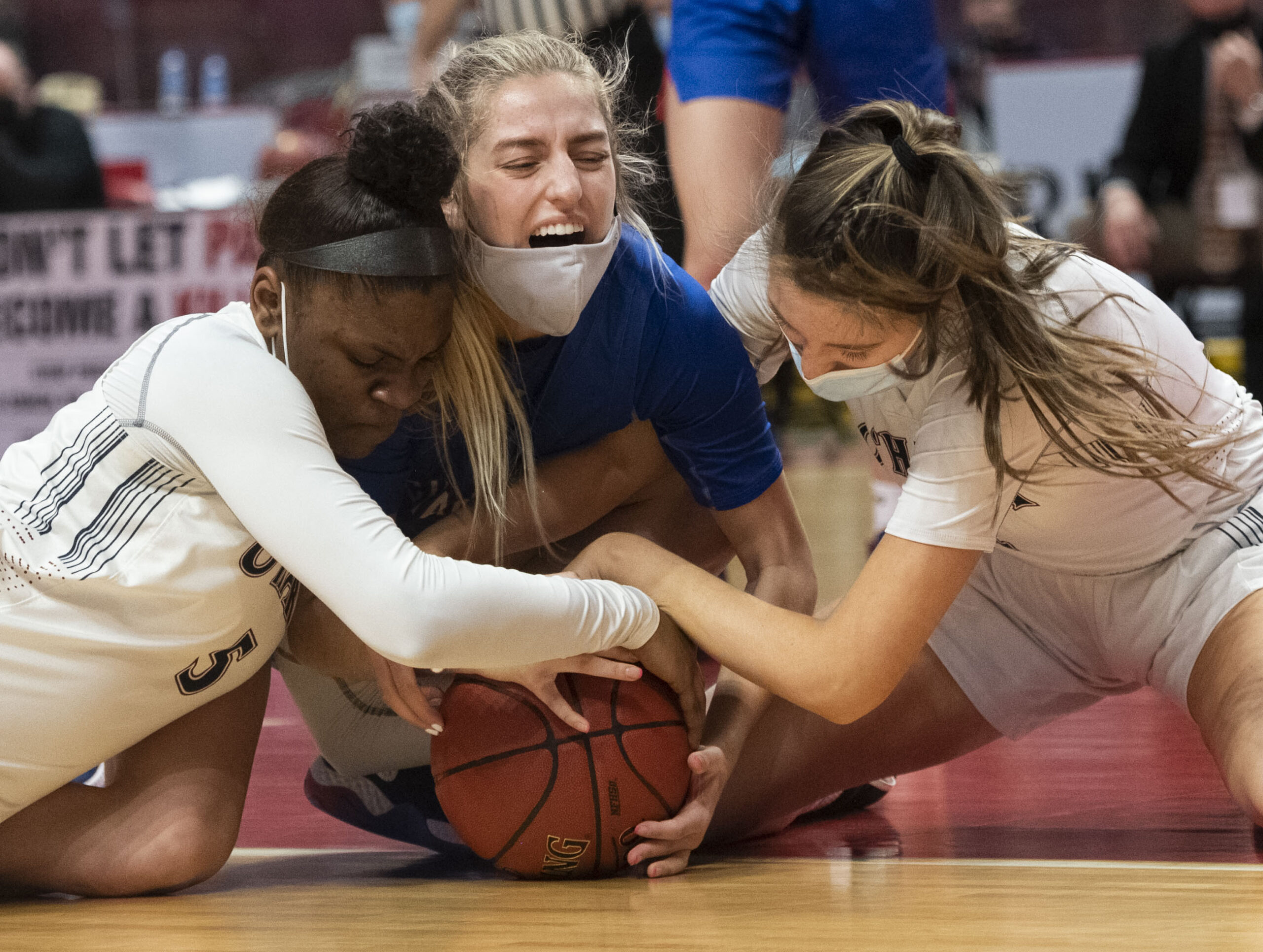From left, Cardinal O’Hara’s Sydni Scott, Chartiers Valley’s Hallie Cowan, and Cardinal O’Hara’s Julia Stellabotte fight for the ball during the PIAA 5A championship on Saturday, March 27, 2021, at Giant Center in Hershey. Chartiers Valley lost 27-51. (Emily Matthews/Post-Gazette)