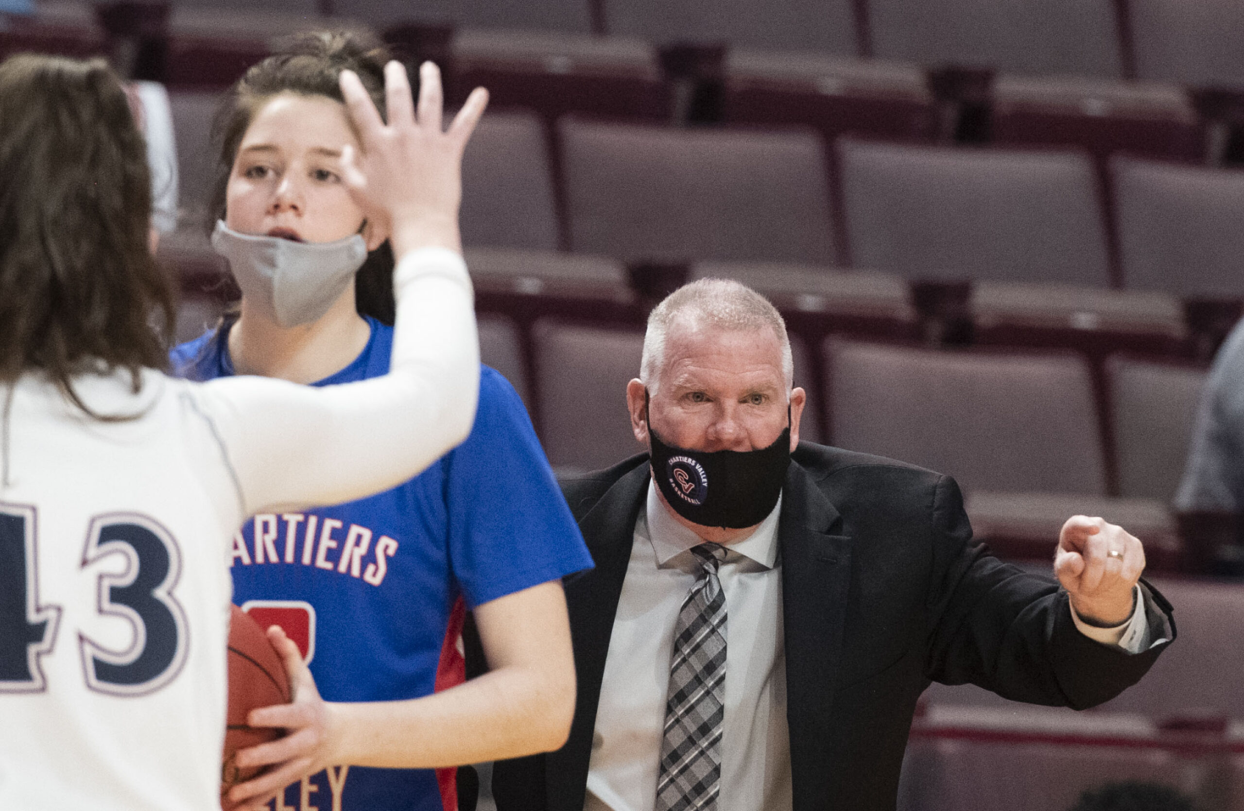 Chartiers Valley coach Tim McConnell shouts to his team during the PIAA 5A championship against Cardinal O’Hara on Saturday, March 27, 2021, at Giant Center in Hershey. Chartiers Valley lost 27-51. (Emily Matthews/Post-Gazette)