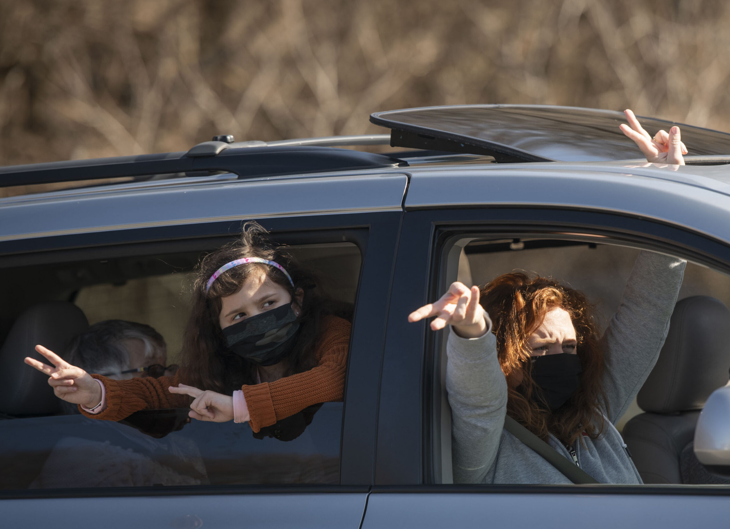 Miriam Wynne, 7, left, and Katie Dawson, both of Upper St. Clair, dance in their car during a Passover singalong on Sunday, March 21, 2021, in Beth El Congregation’s parking lot in Scott. The Beth El Congregation was also participating in South Hills Interfaith Movement’s second annual March to Sack Hunger campaign with a drive-thru drop off food collection of non-kosher items for Passover. (Emily Matthews/Post-Gazette)