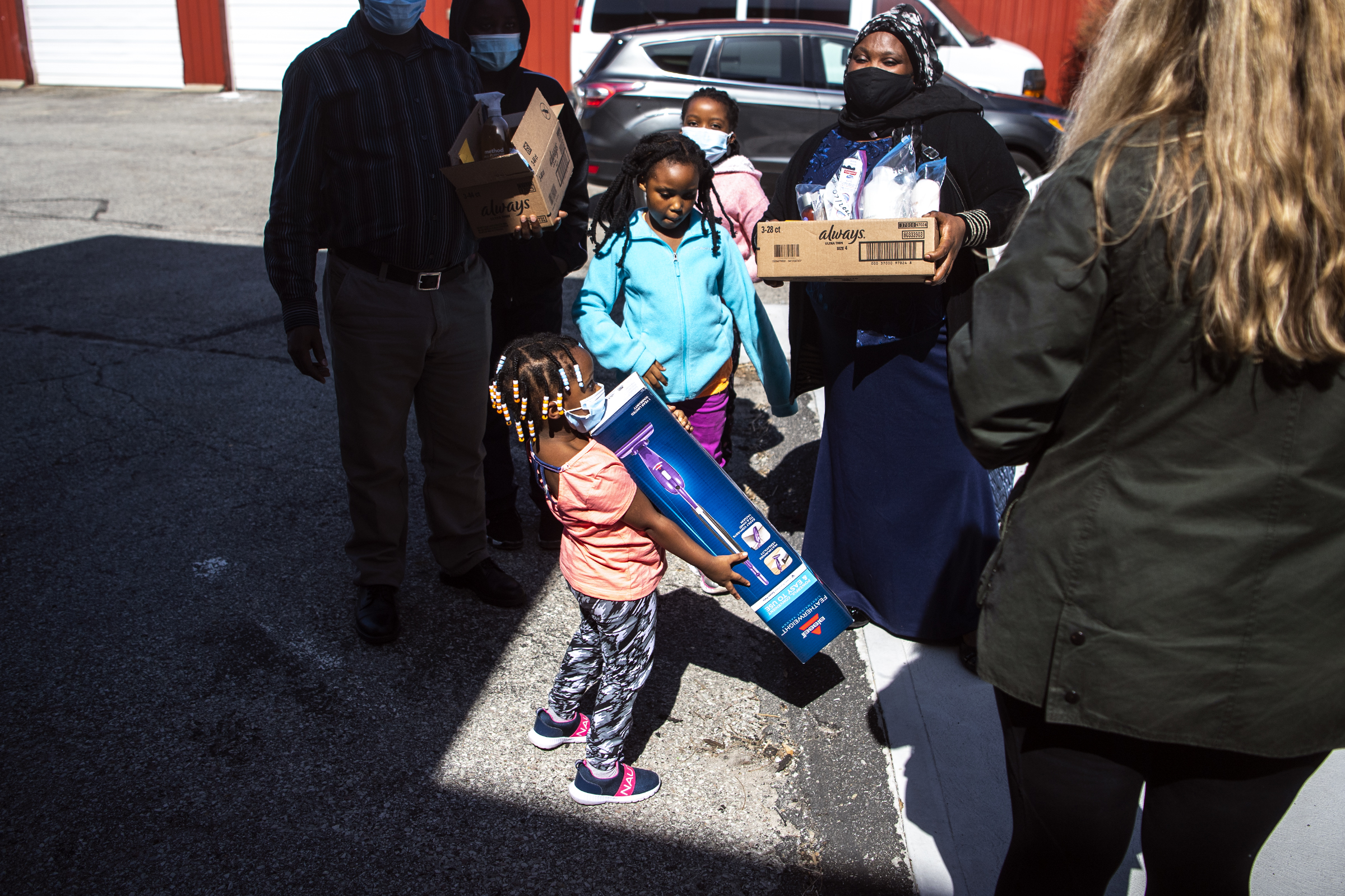 Kevine Ineza, center, 2, of Northview Heights, holds on to a vacuum box while at a distribution event with her family, including her mother Valentina Giramata, right, at Hello Neighbor, which provides services for immigrants and refugees, Sunday, March 21, 2021, in Larimer. (Alexandra Wimley/Post-Gazette)