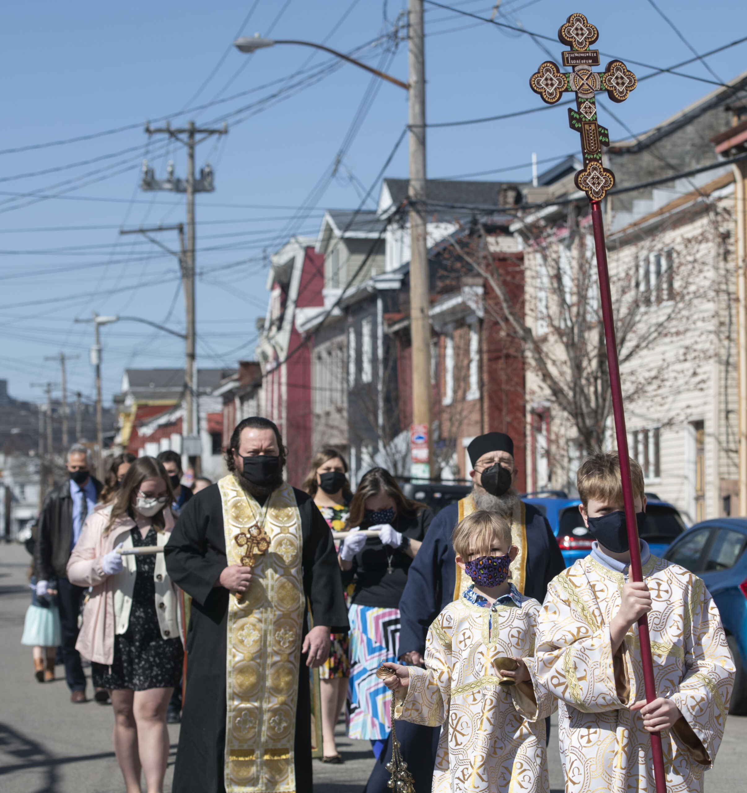 Thomas Sheptak, 13, of Butler, right, and James Sendak, 10, of Reserve, both with St. Vladimir Ukrainian Orthodox Church, lead a procession with icons from the Wrestling With Angels museum exhibition on Sunday, March 21, 2021, on Sidney Street in South Side. St. Vladimir Ukrainian Orthodox Church and St. Mary Orthodox Church congregants carried icons in a joint procession and outdoor service to commemorate the first Sunday of Great Lent. (Emily Matthews/Post-Gazette)