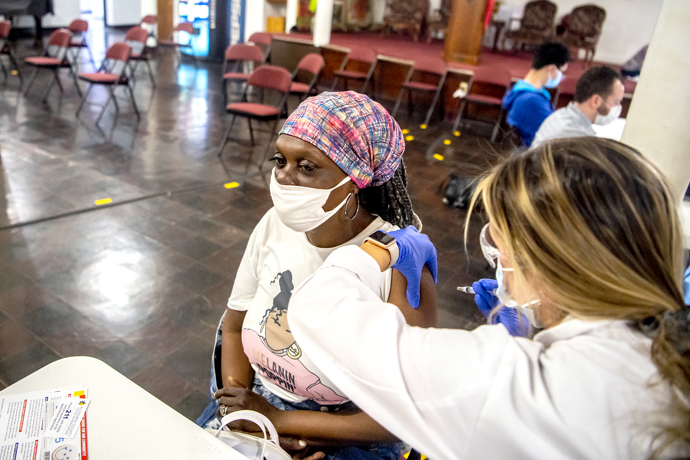 Terri Hall, of the Hill District, receives the COVID-19 vaccine from Mackenzie Walters, a pharmacy student at Duquesne University, at a clinic run by the Allegheny County Health Department in partnership with the Duquesne University Center for Integrative Health at Central Baptist Church in the Hill District, Monday, April 5, 2021. The clinic made the vaccine available to members of the community with no appointment needed. (Alexandra Wimley/Post-Gazette)