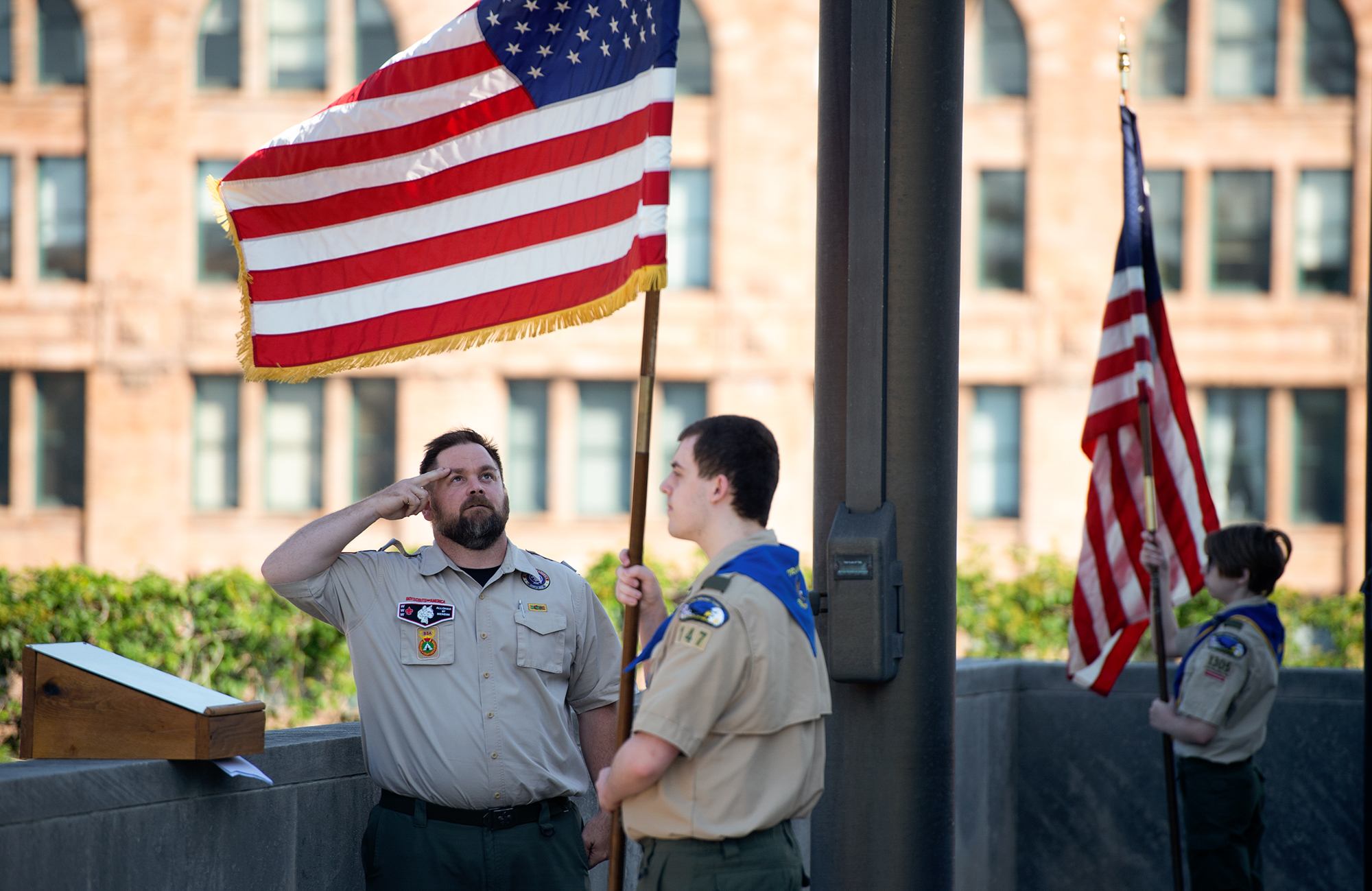 Brian Beach, district executive of Laurel Highlands Council at Boy Scouts of America, salutes while leading the Pledge of Allegiance during the Boy Scouts Flag Day ceremony at the Flag Plaza Scout Center, Monday, June 14, 2021, in Pittsburgh. Aiden Forrest, 17, an Eagle Scout, holds the flag. (Pam Panchak/Post-Gazette)