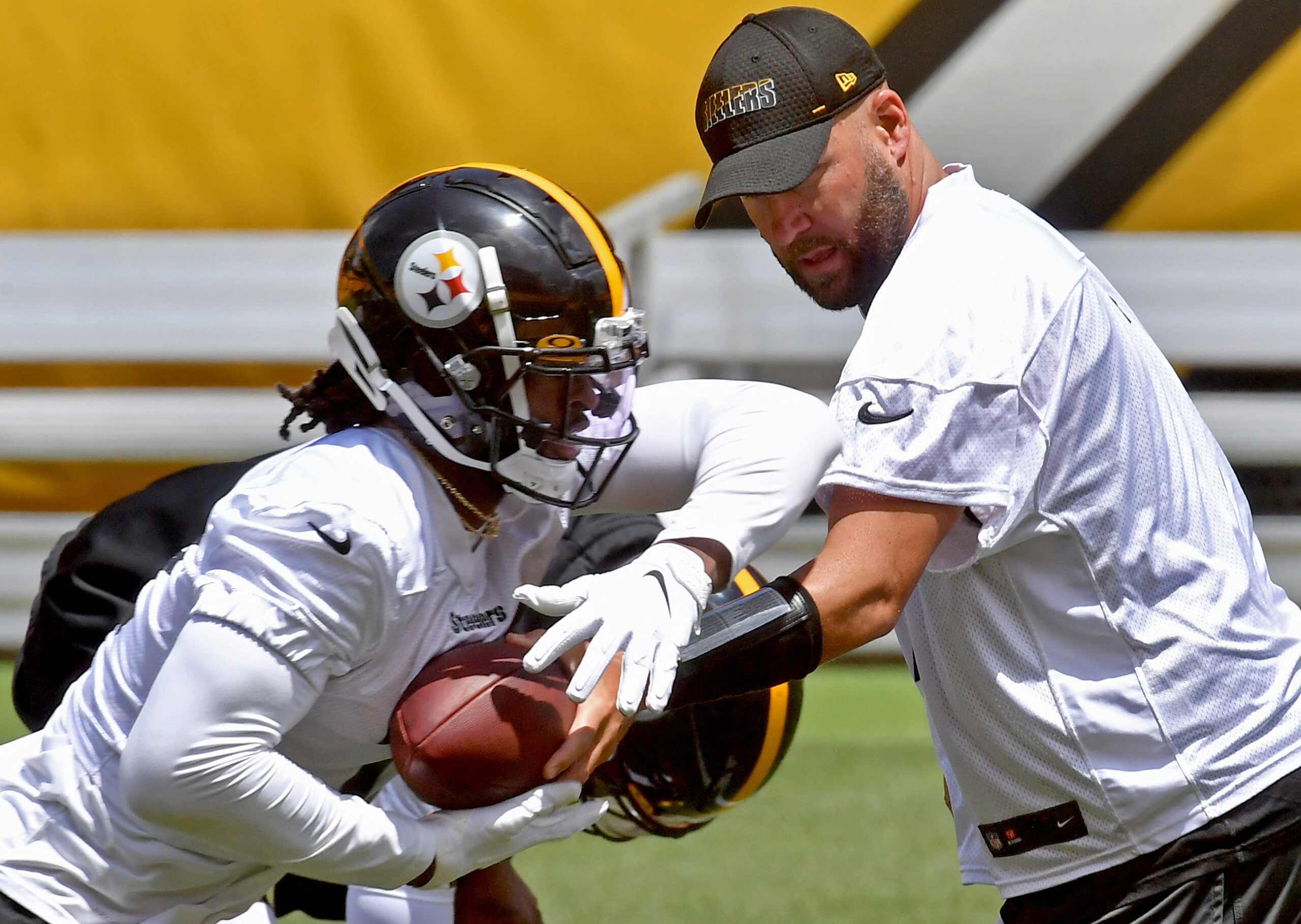 20210615mfsteelerssports01 June 16, 2021 • 2560 × 1818 • Week in photos: June 13-19 Steelers quarterback Ben Roethlisberger hands off to running back Najee Harris during minicamp Tuesday, June 15, 2021, at Heinz Field. (Matt Freed/Post-Gazette)