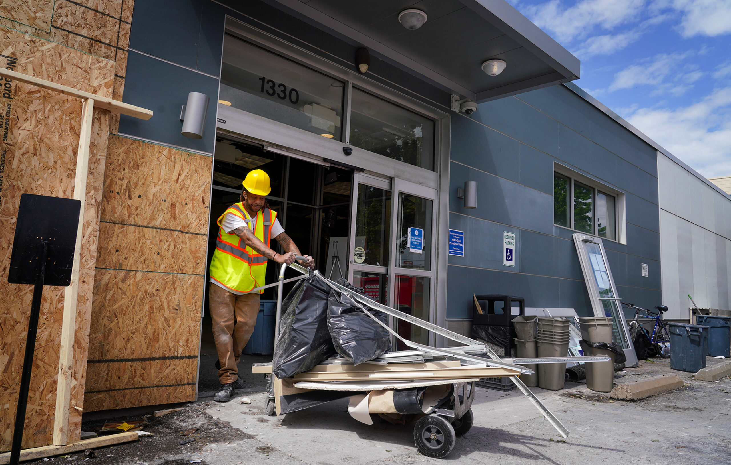 Workers removed debris from a heavily damaged plasma donation center on the North Side on Tuesday, June 15, 2021. The Biomat building on Western Avenue has been closed since Saturday, when a vehicle traveling at high speed crashed into the structure, killing two employees and another person. (Steve Mellon/Post-Gazette)