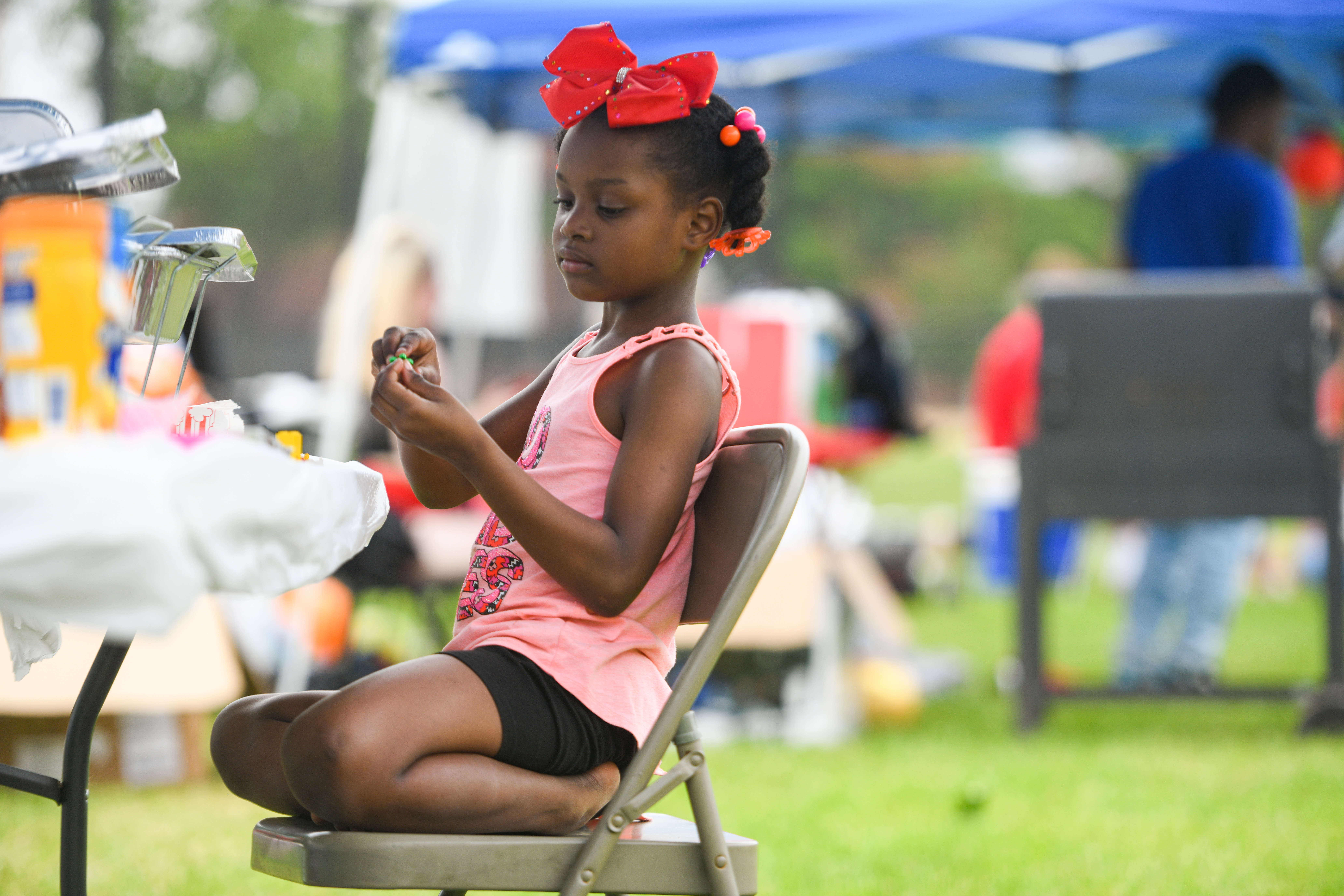 Remi Freeman, 6, of Sheraden, worked at a Lego table at the WPA Juneteenth Youth Fest at Mellon Park on Friday, June 18, 2021 in Pittsburgh. The Youth Fest, for children and youth ages 6-17, continues Saturday and Sunday and includes a flag football tournament, basketball tournament, fun zone, deck hockey and gaming zone. (Steve Mellon/Post-Gazette)