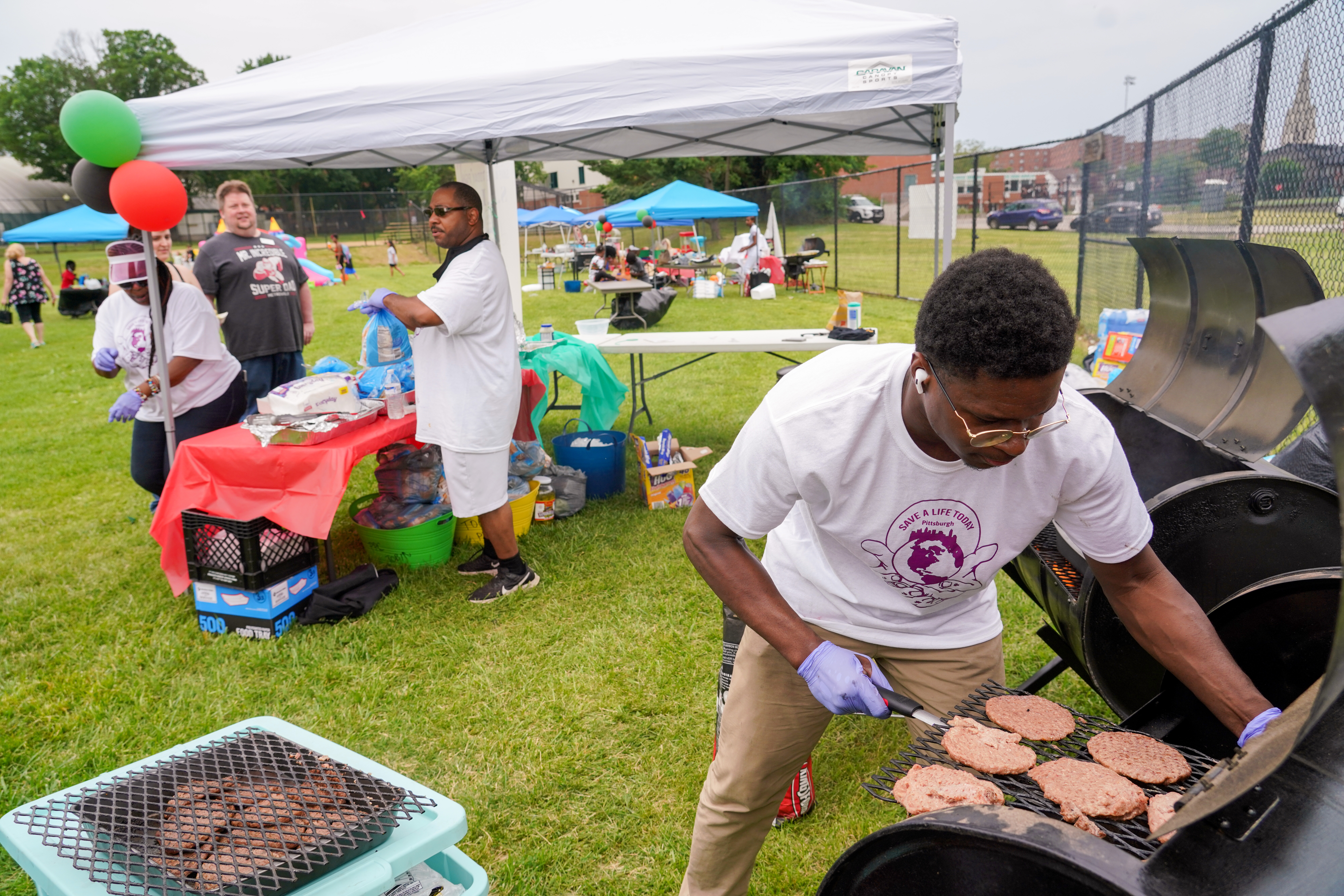 Tosin Adebay of Braddock, prepares to cook hamburgers for the Safe A Life Today Pittsburgh booth at the WPA Juneteenth Youth Fest at Mellon Park on Friday, June 18, 2021 in Pittsburgh. The Youth Fest, for children and youth ages 6-17, continues Saturday and Sunday and includes a flag football tournament, basketball tournament, fun zone, deck hockey and gaming zone. (Steve Mellon/Post-Gazette)