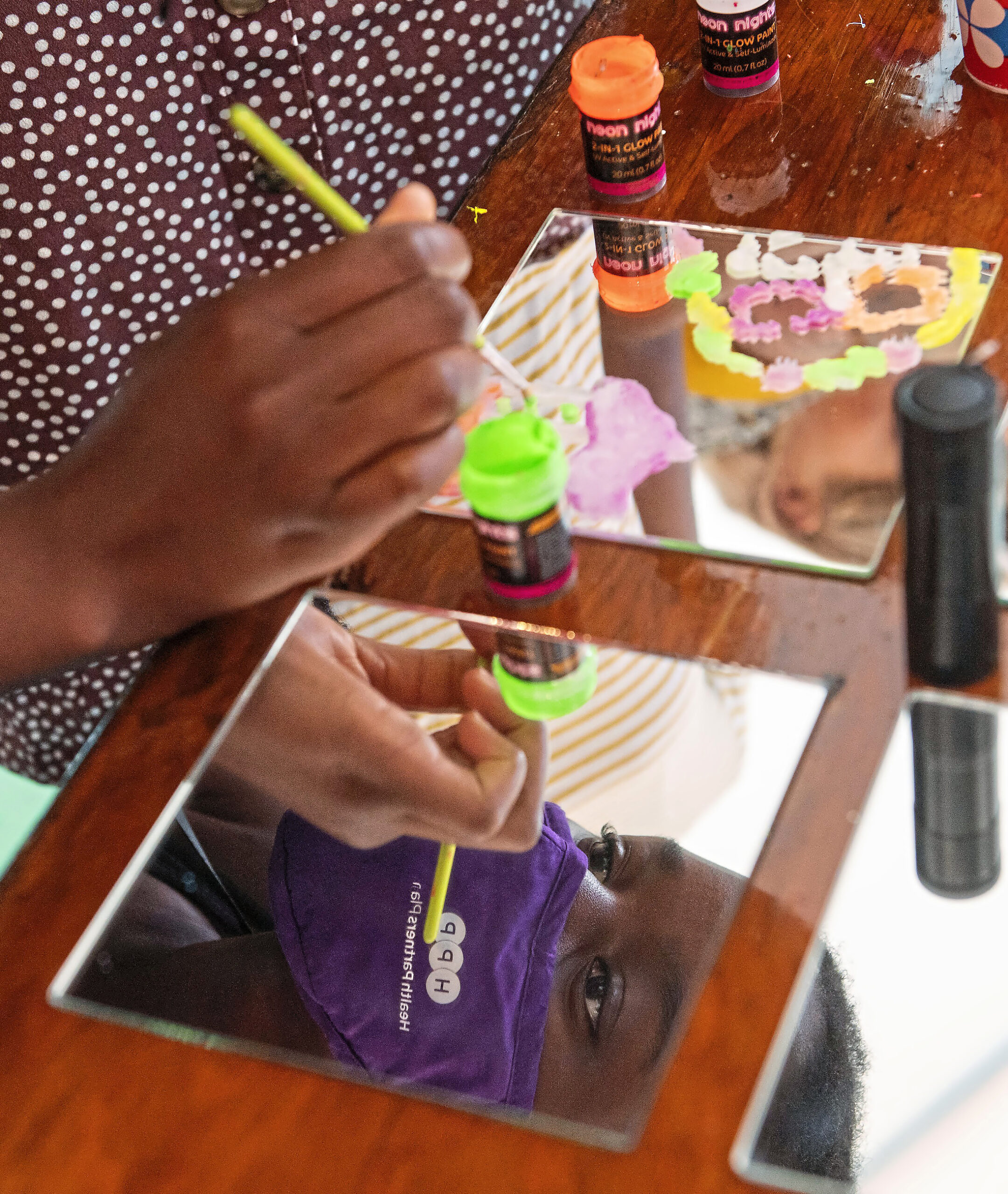 Zite Ezeh, of Philadelphia, paints on a mirror using neon glow paint at the table of artist Mikael Owunna, whose work includes photo of Black people whose bodies he paints with fluorescent paint and takes photos of under ultraviolet light, at “Art as Liberation,” an event featuring 15 Black visual artists, on Friday, June 18, 2021, in Allegheny Center. The art event celebrated Juneteenth, a holiday that recognizes June 19, 1865 as the day Union General Gordon Granger arrived in Galveston, Texas to inform the enslaved African Americans of their freedom and that the Civil War had ended. (Emily Matthews/Post-Gazette)