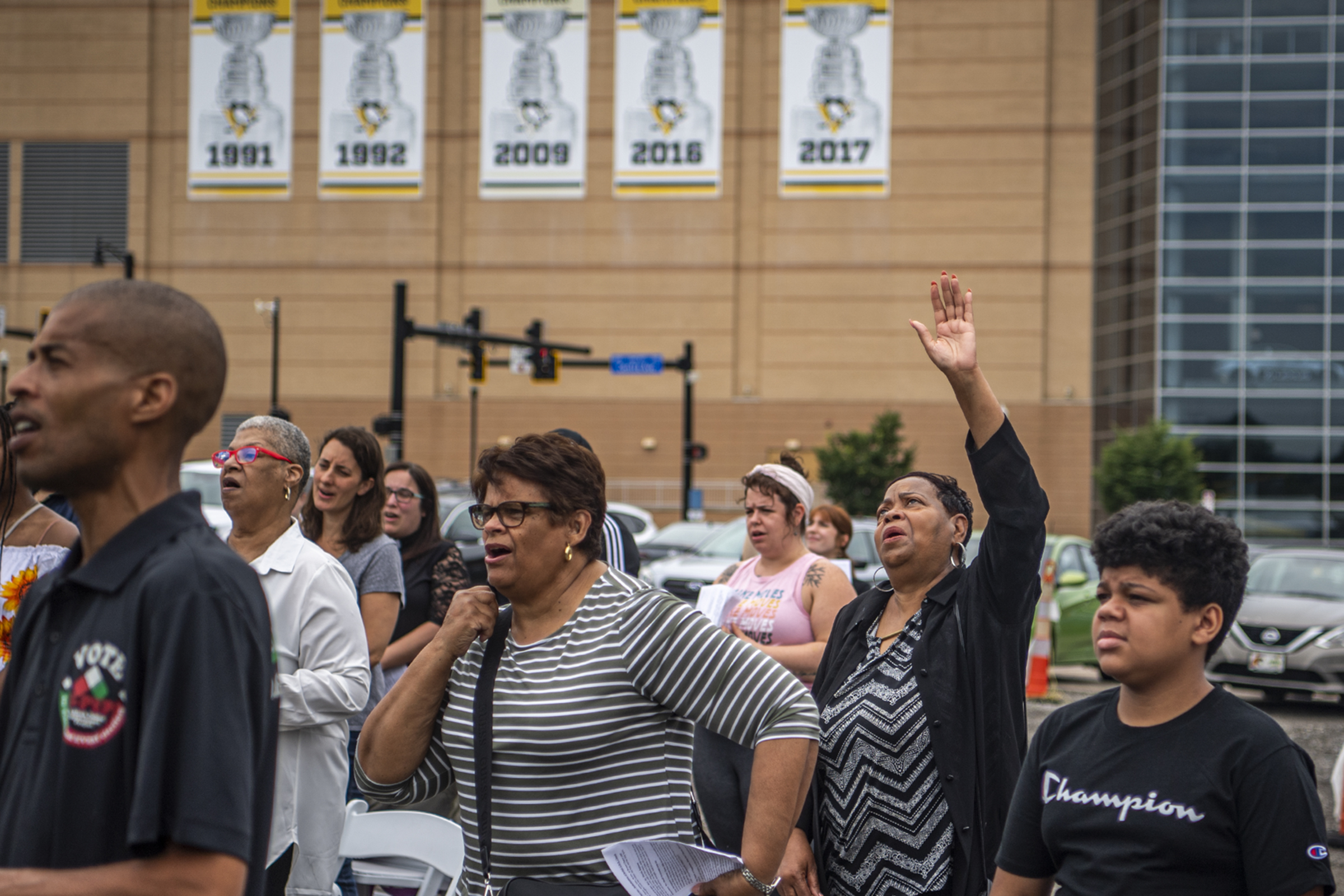 Attendees, including Rev. Dorothy Stubbs, second from right, of Pittsburgh a pastor with New Evangelistic Ministries, worship during a service on Juneteenth, Saturday, June 19, 2021, in the parking lot across from PPG Paints Arena in the Hill District to rededicate the site that once held the Bethel AME Church before it was seized via eminent domain as part of the demolition for the Civic Arena site in the 1950s. The event aimed to gain support for the congregation’s goal to have the land returned to them and to build a multipurpose community building. (Alexandra Wimley/Post-Gazette)