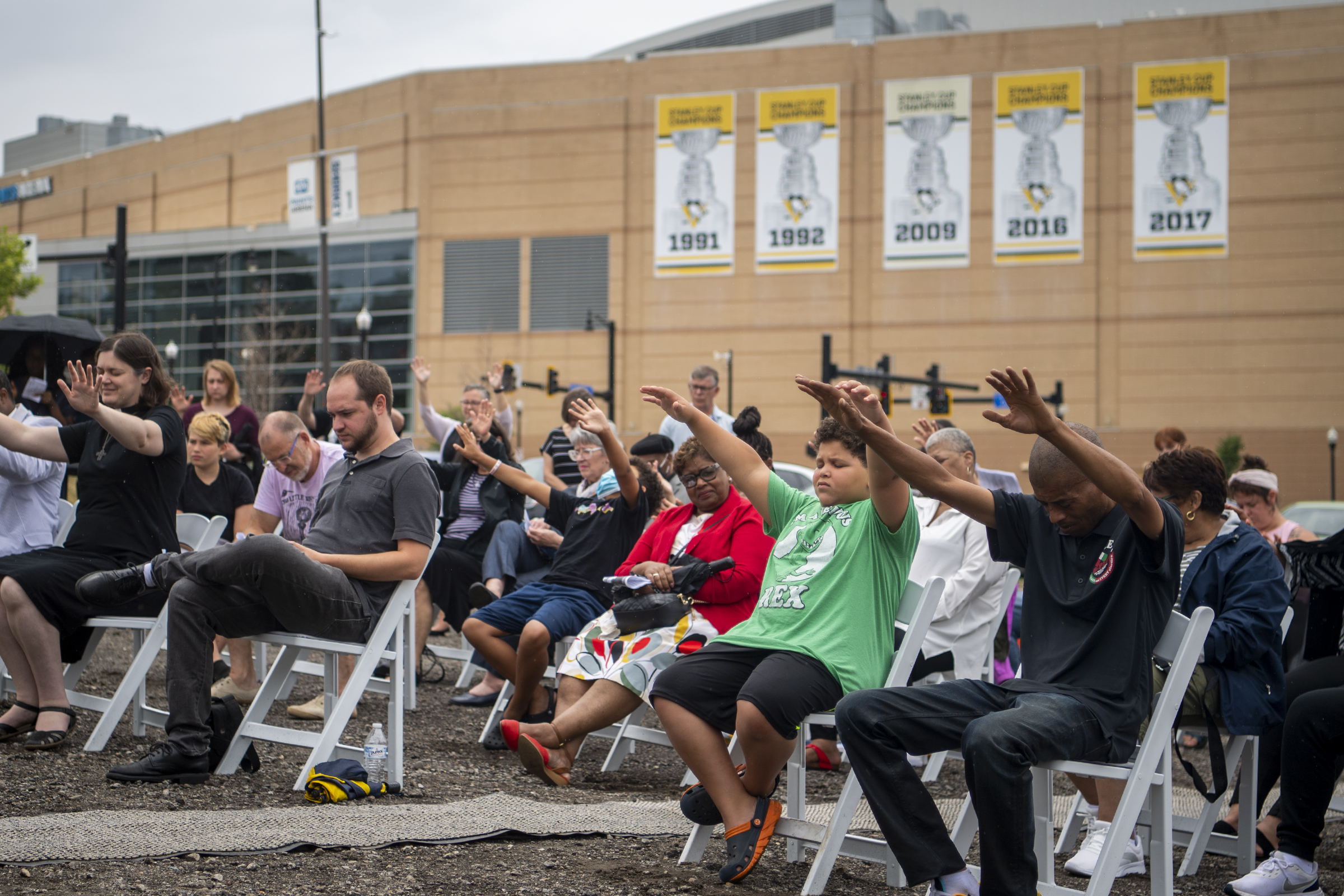 Attendees pray during a service on Juneteenth, Saturday, June 19, 2021, in the parking lot across from PPG Paints Arena in the Hill District, to rededicate the site that once held the Bethel AME Church before it was seized via eminent domain as part of the demolition for the Civic Arena site in the 1950s. The event aimed to gain support for the congregation’s goal to have the land returned to them and to build a multipurpose community building. (Alexandra Wimley/Post-Gazette)