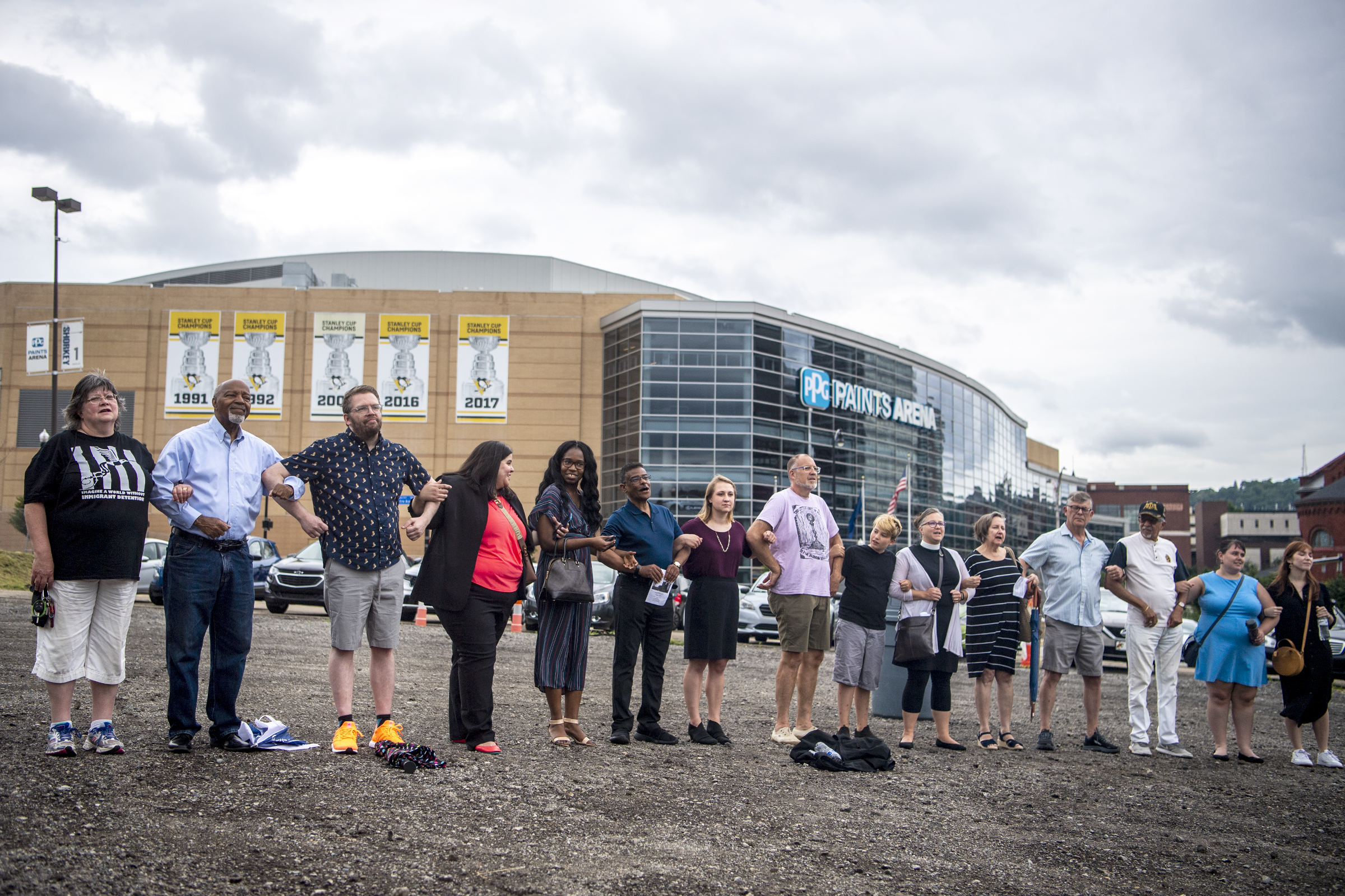 People worship during a service on Juneteenth, Saturday, June 19, 2021, in the parking lot across from PPG Paints Arena in the Hill District, to rededicate the site that once held the Bethel AME Church before it was seized via eminent domain as part of the demolition for the Civic Arena site in the 1950s. The event aimed to gain support for the congregation’s goal to have the land returned to them and to build a multipurpose community building. (Alexandra Wimley/Post-Gazette)