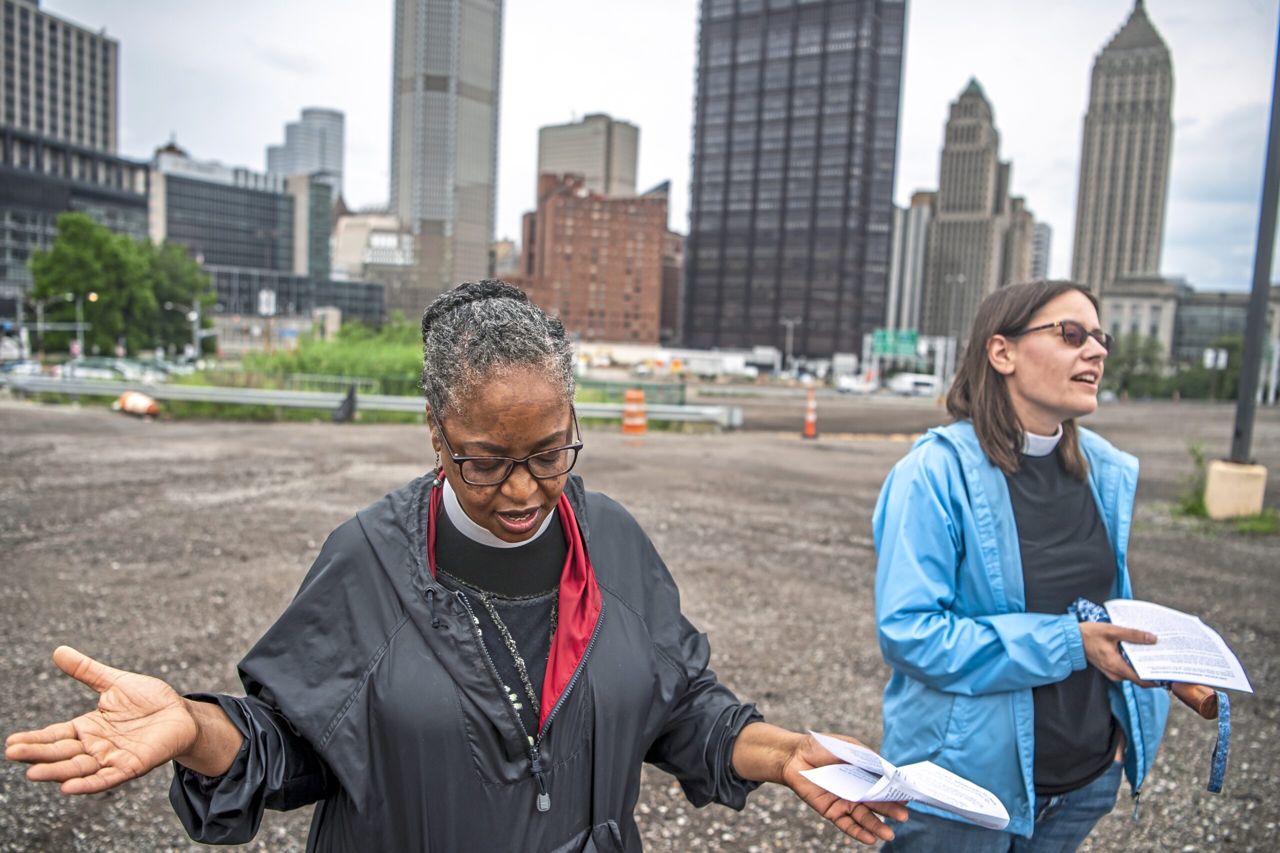 Rev. Brenda Henry, of East Carnegie, Pa. with Pittsburgh Lutheran United Ministries, and Rev. Jennifer Peters McCurry, of Pittsburgh, with First English Evangelical Lutheran Church, worship during a service on Juneteenth, Saturday, June 19, 2021, in the parking lot across from PPG Paints Arena in the Hill District, to rededicate the site that once held the Bethel AME Church before it was seized via eminent domain as part of the demolition for the Civic Arena site in the 1950s. The event aimed to gain support for the congregation’s goal to have the land returned to them and to build a multipurpose community building. (Alexandra Wimley/Post-Gazette)