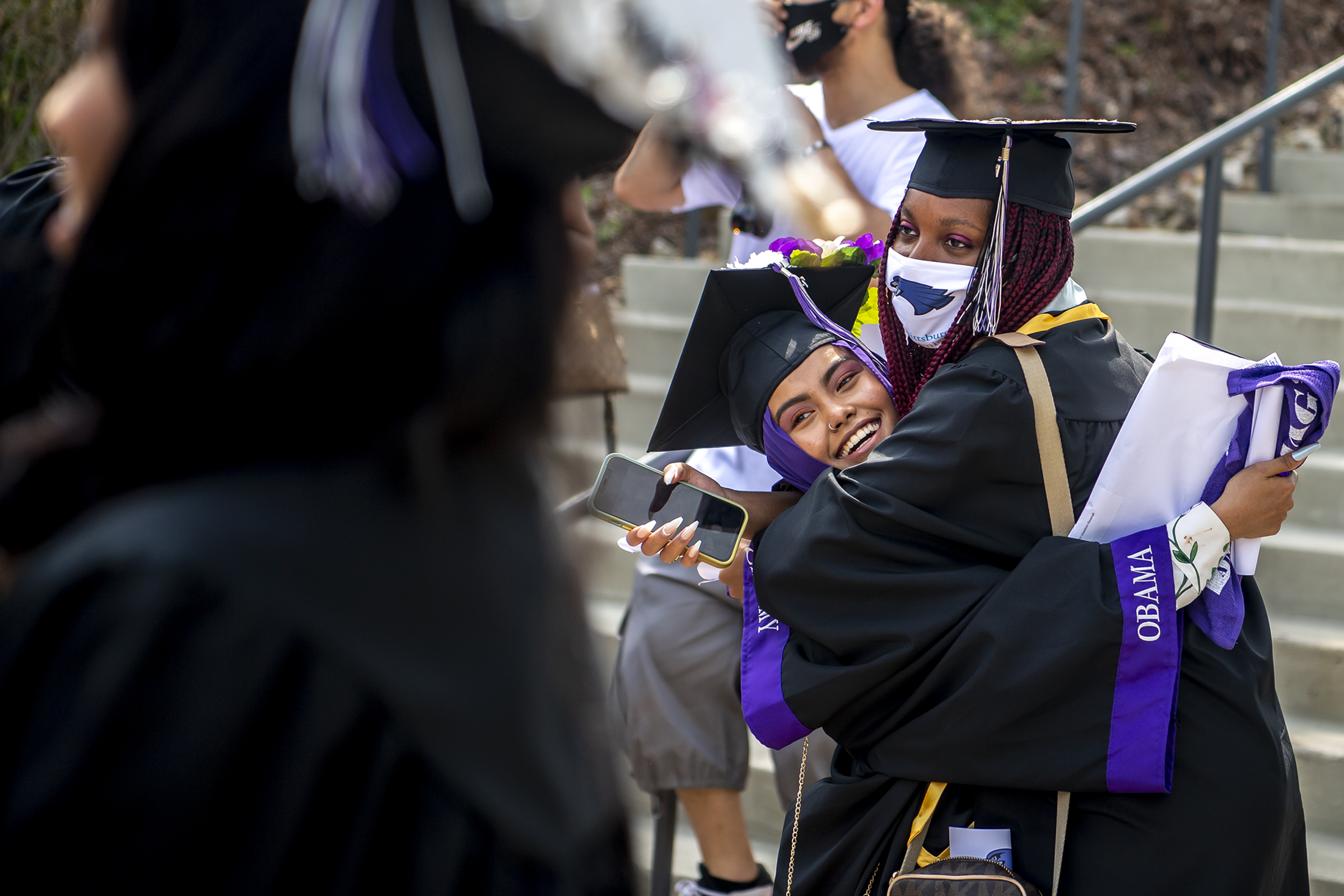 Uswatun Fuadin and Zharia White hug after the graduation ceremony for the Barack Obama Academy of International Studies, Sunday, June 13, 2021, at the Petersen Events Center in Oakland. (Alexandra Wimley/Post-Gazette)