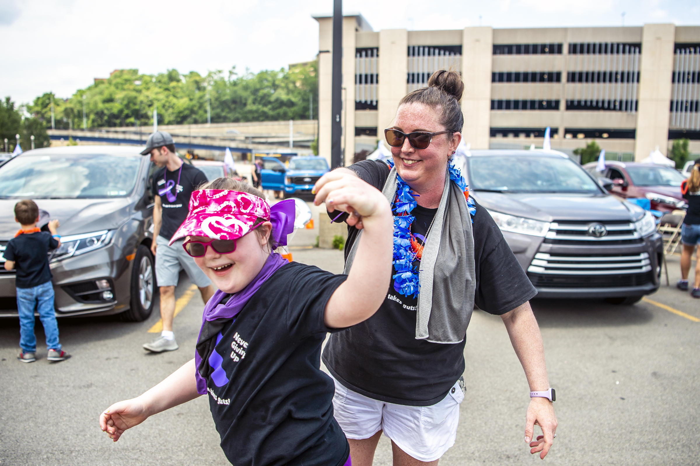Zoe Dunlap, 9, of South Fayette, dances with Kristi Lang, of South Fayette, both with the fundraising team ÒKristi’s CrusadersÓ, while waiting for the program to start during the CrohnÕs and Colitis FoundationÕs annual Pittsburgh Take Steps fundraiser drive-in event, Sunday, June 13, 2021, on the North Side. The Take Steps fundraiser raises awareness and funds to support people living with inflammatory bowel disease and to increase the pace of research. (Alexandra Wimley/Post-Gazette)