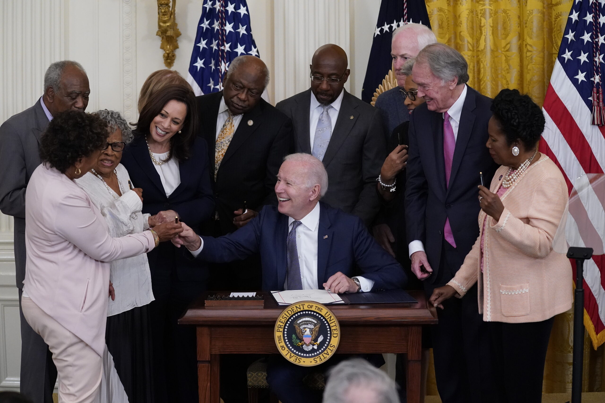 FILE – In this June 17, 2021, file photo, President Joe Biden hands a pen to Rep. Barbara Lee, D-Calif., after signing the Juneteenth National Independence Day Act, in the East Room of the White House in Washington. From left, Rep. Barbara Lee, D-Calif, Rep. Danny Davis, D-Ill., Opal Lee, Sen. Tina Smith, D-Minn., obscured, Vice President Kamala Harris, House Majority Whip James Clyburn of S.C., Sen. Raphael Warnock, D-Ga., Sen. John Cornyn, R-Texas, Rep. Joyce Beatty, D-Ohio, obscured, Sen. Ed Markey, D-Mass., and Rep. Sheila Jackson Lee, D-Texas. (AP Photo/Evan Vucci, File)