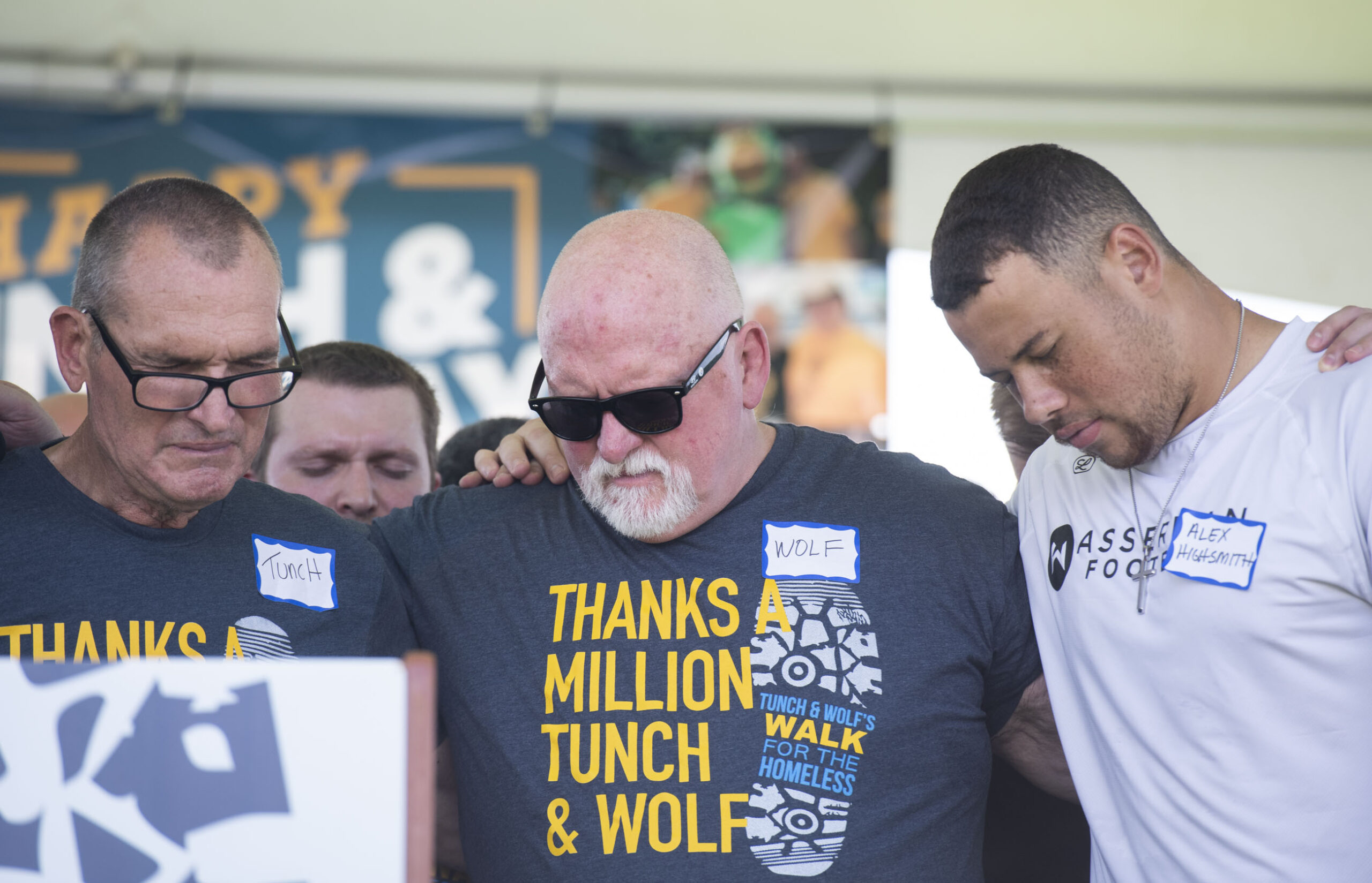 From left, Tunch Ilkin and Craig Wolfley, former Steelers teammates, and Steelers outside linebacker Alex Highsmith participate in a prayer for Tunch Ilkin, who was diagnosed with ALS, at the Light of Life Rescue Mission’s 19th Annual Tunch & Wolf’s Walk for the Homeless on Sunday, June 13, 2021, on the Great Lawn on the North Shore. The money raised during this year’s walk will go towards the “Thanks a Million” campaign with a goal to raise $1 million in honor of Ilkin and Wolfley “Tunch & Wolf” supporting the Mission for 35 years. The campaign will help fund the renovation of a building that will be home to long-term residential programs. (Emily Matthews/Post-Gazette)