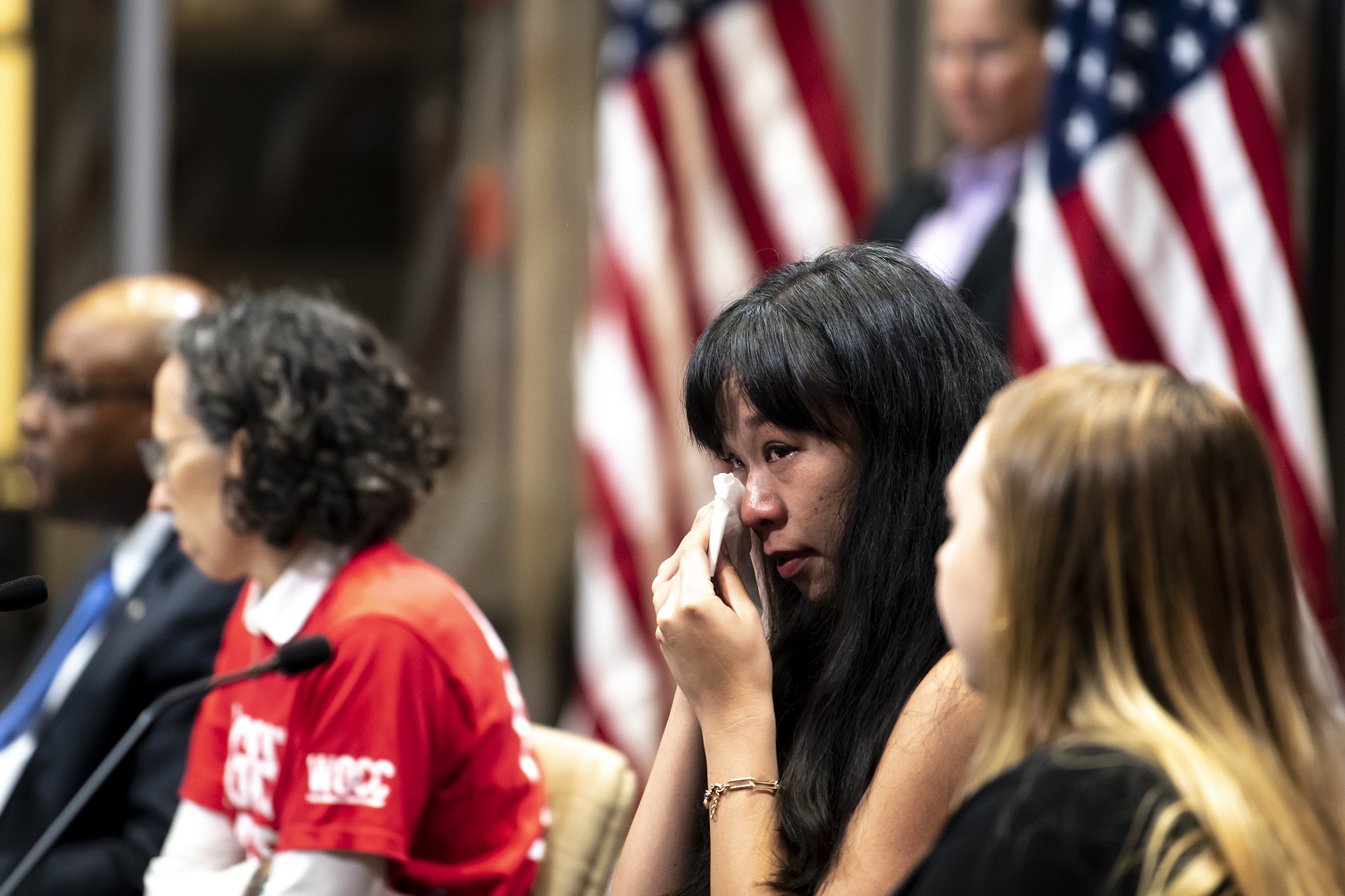 Jennifer Chow, second from right, a Communications Workers of America union member, wipes tears after becoming emotional while speaking about her concerns about joining a union and inequalities in her field during a labor task force roundtable at the IBEW Local 5 union hall on the South Side, Monday, June 21, 2021. (Alexandra Wimley/Post-Gazette)