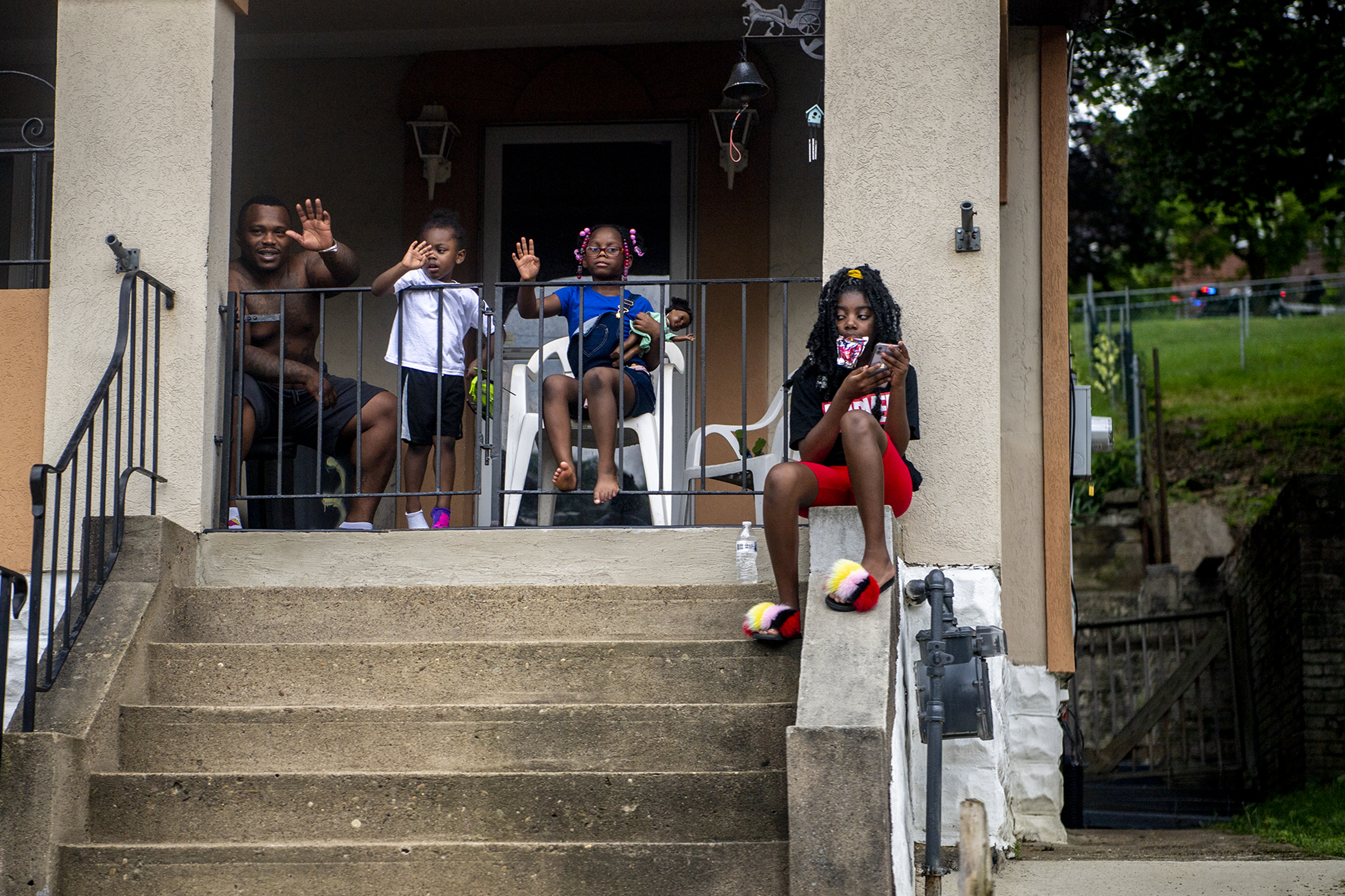 People wave from their porch as the motorcade carrying Vice President Kamala Harris passes on its way to Brookline Memorial Recreation Center in Brookline, Monday, June 21, 2021. (Alexandra Wimley/Post-Gazette)