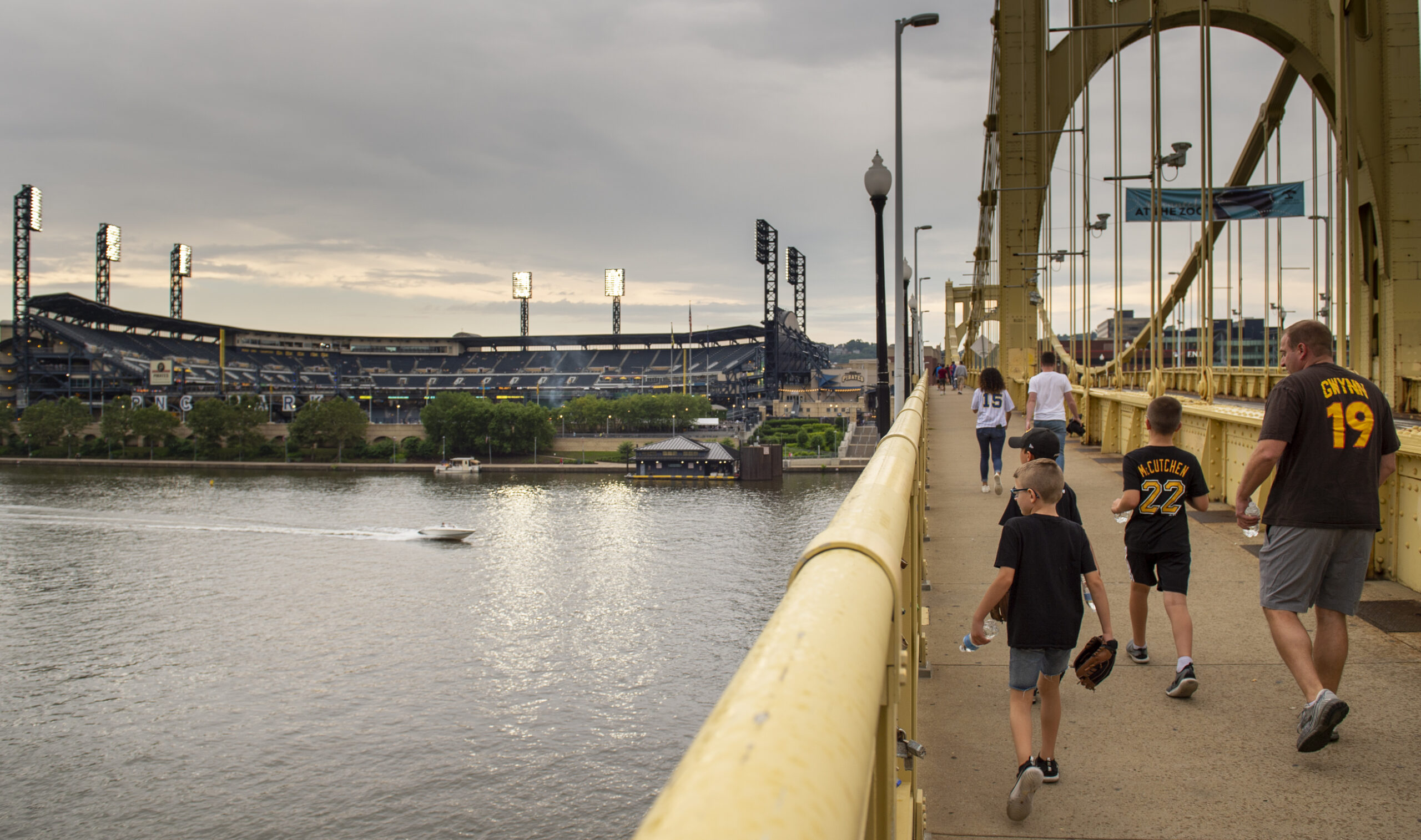 Fans walk over the Clemente Bridge on game day, where the Pirates play the Brewers at PNC Park for the first game that 100% spectator capacity is back, July 1, 2021, on the North Shore. (Ben Braun/Post-Gazette)
