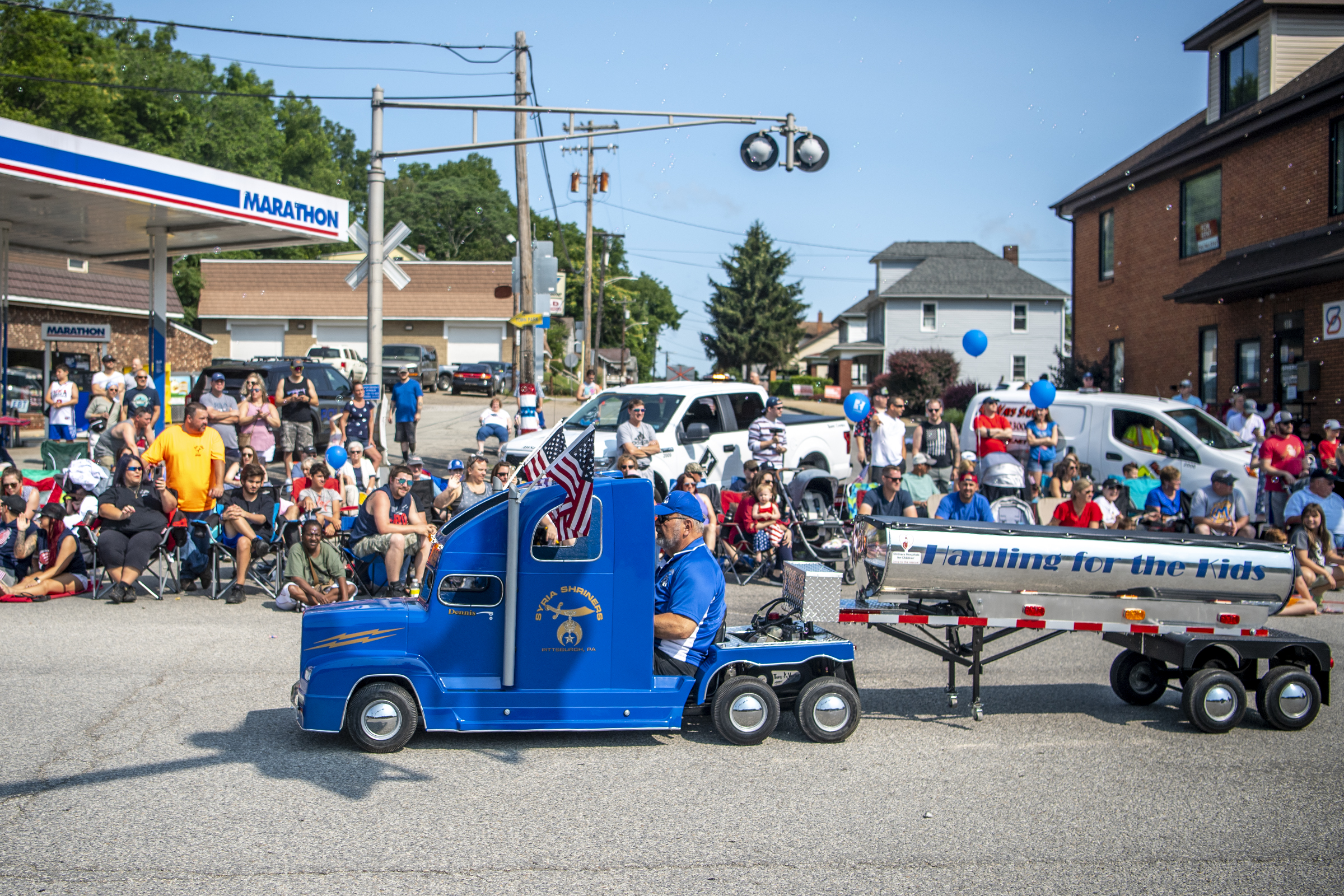 A member of the Syria Shriners passes attendees in a miniature truck during the annual Canonsburg Fourth of July parade, Saturday, July 3, 2021, in Canonsburg. The parade returned this year after being cancelled in 2020 due to the pandemic. (Alexandra Wimley/Post-Gazette)