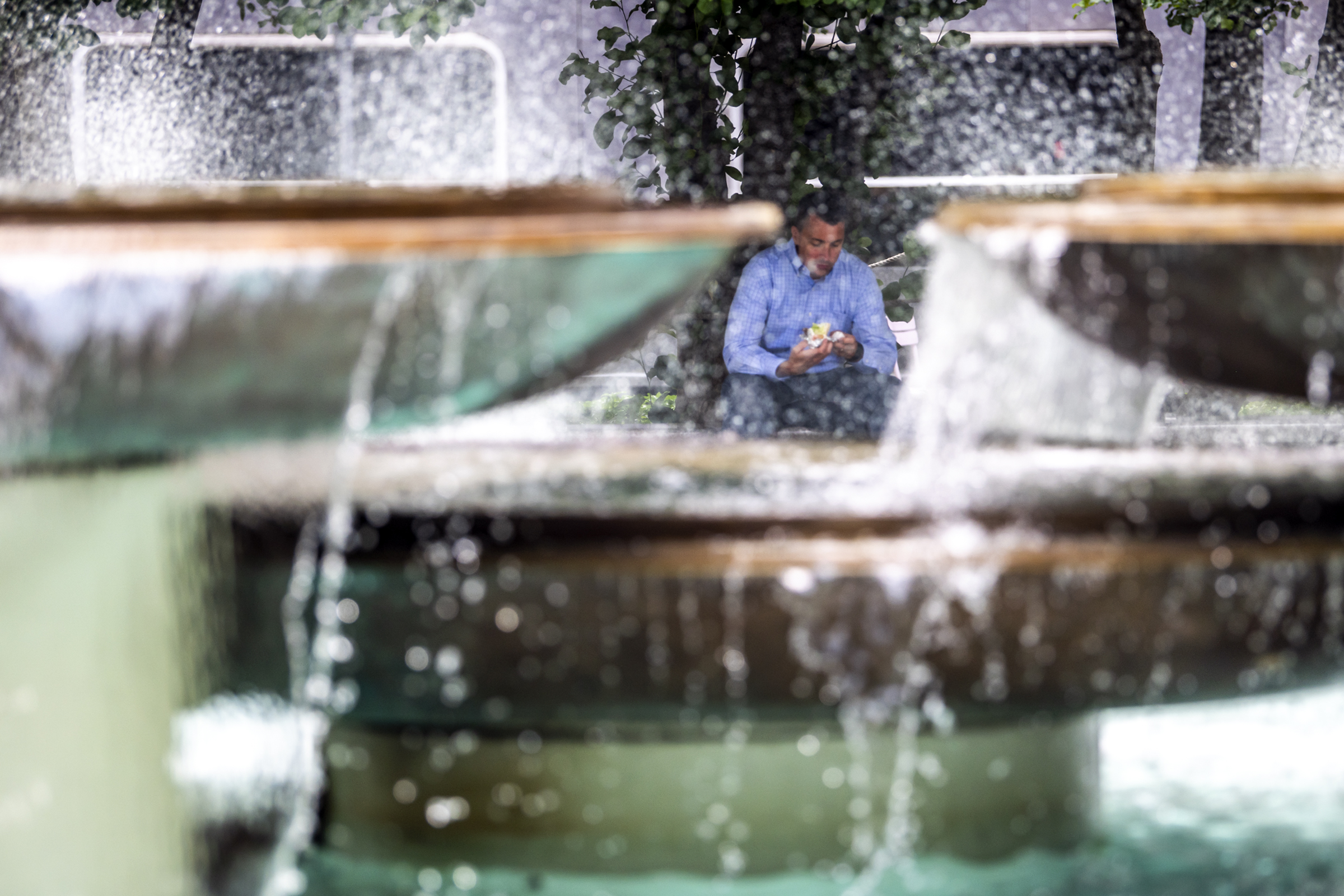A man has lunch by the fountain in Mellon Square during the parkÕs ÒSummer at the SquareÓ kick-off event to launch summer programs and events in the square and celebrate its reopening after being closed in 2020 due to the COVID-19 pandemic, Wednesday, June 30, 2021, Downtown. (Alexandra Wimley/Post-Gazette)