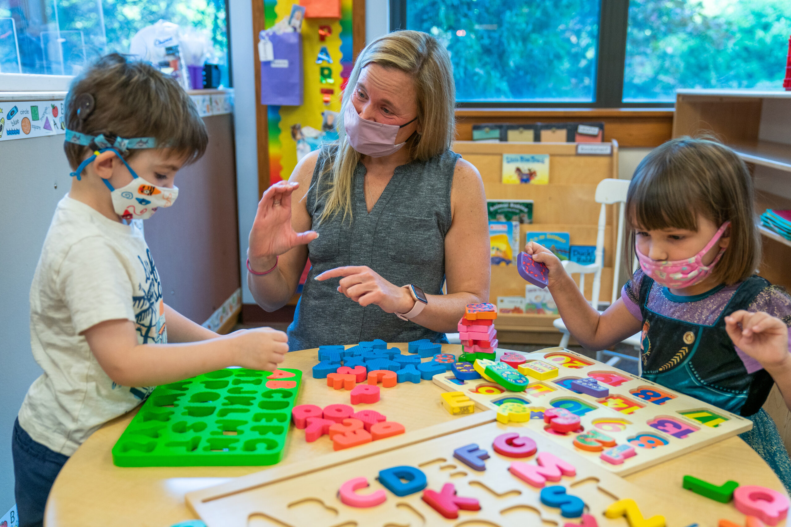 Teacher Christie Homell, center, with Zachary R. And Marie D. on the first day of school at the Western Pennsylvania School for the Deaf on Monday, Aug. 23, 2021, in Edgewood. (Andrew Rush/Post-Gazette)