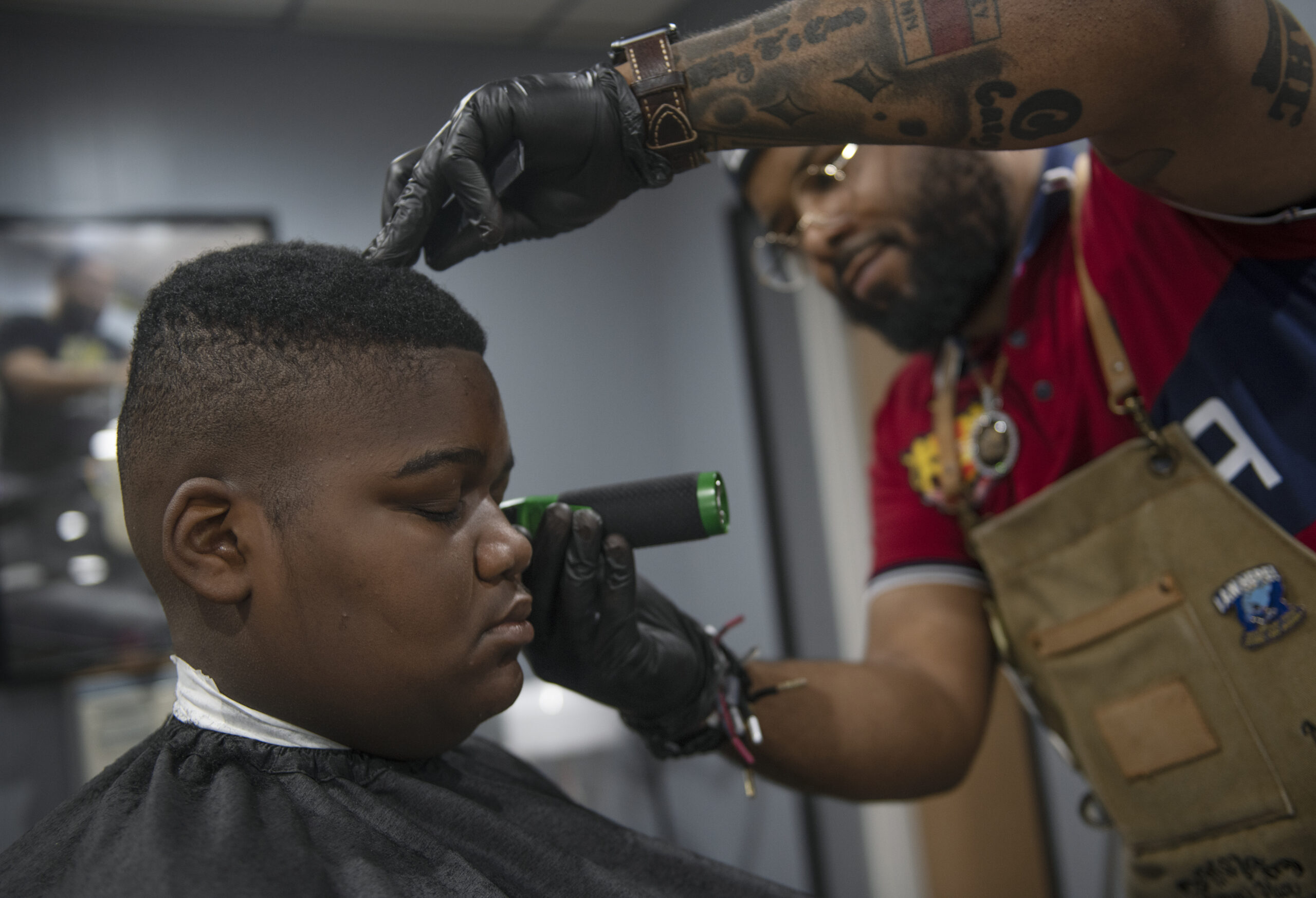 PLEASE WITHHOLD MY BYLINE/CREDIT.) #Standalone. Nicolas Nabors, a barber and owner of Ramsey’s Place, gives a fresh cut to Denairo Price, 11, of Vandergrift, Monday, Aug. 23, 2021, at Ramsey’s Place in Vandergrift. Mr. Nabors, along with barber Ismael Santiago and hairstylist Casey Walsh, volunteered their time providing free back-to-school haircuts to any student in prekindergarten through 12th grade. The event was sponsored by the Kiski Valley Lancers Youth Football and Cheer Organization and Ramsey’s Place. “The goal is to get as many kids as possible with fresh cuts,” said Kyle Harris, president of the youth football organization.” (Nate Guidry/Post-Gazette)