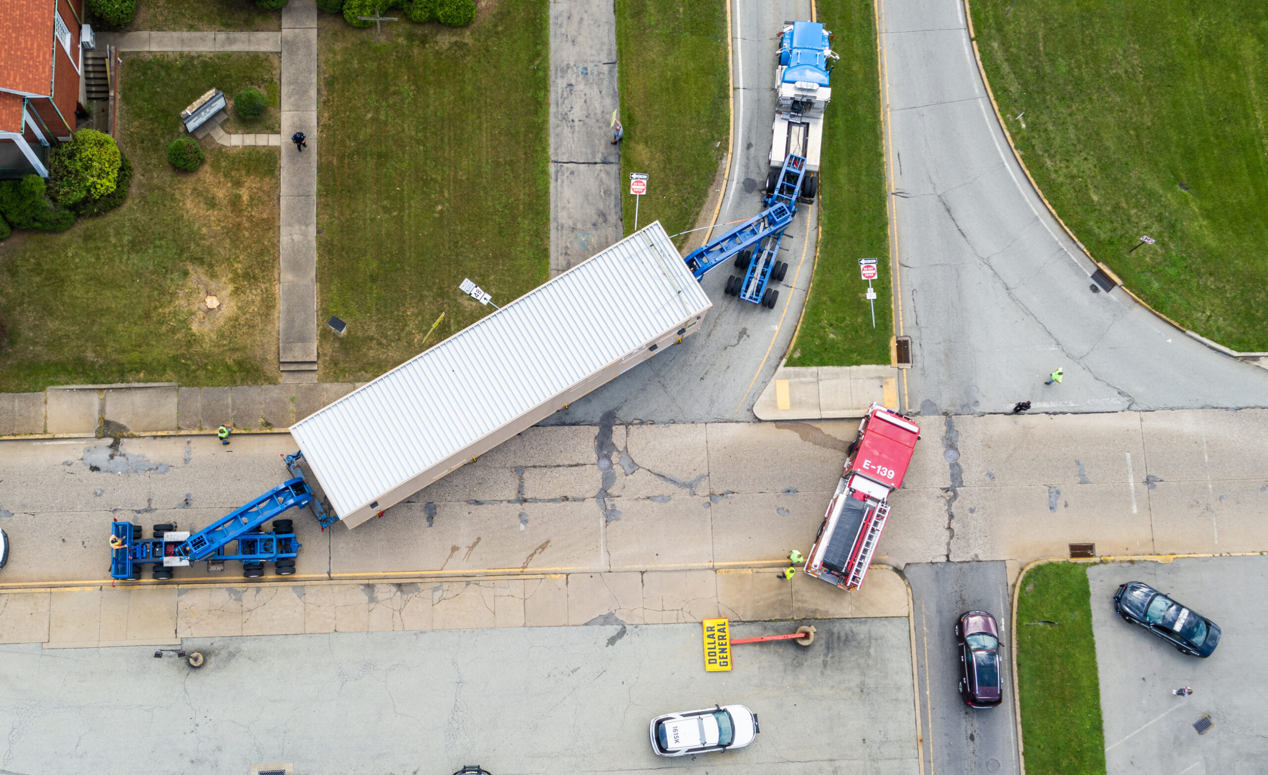 A truck run by Miller Transfer of Rootstown, Ohio moves a nearly 70-foot-long building onto the Rt. 51 off ramp en route to Greensburg on Thursday, Aug. 26, 2021, in Elizabeth Township. The 9-axle tractor-trailer combination traveled south on the north-bound lanes of Rt. 51. Roads along the route were closed for around 30 minutes. (Andrew Rush/Post-Gazette)