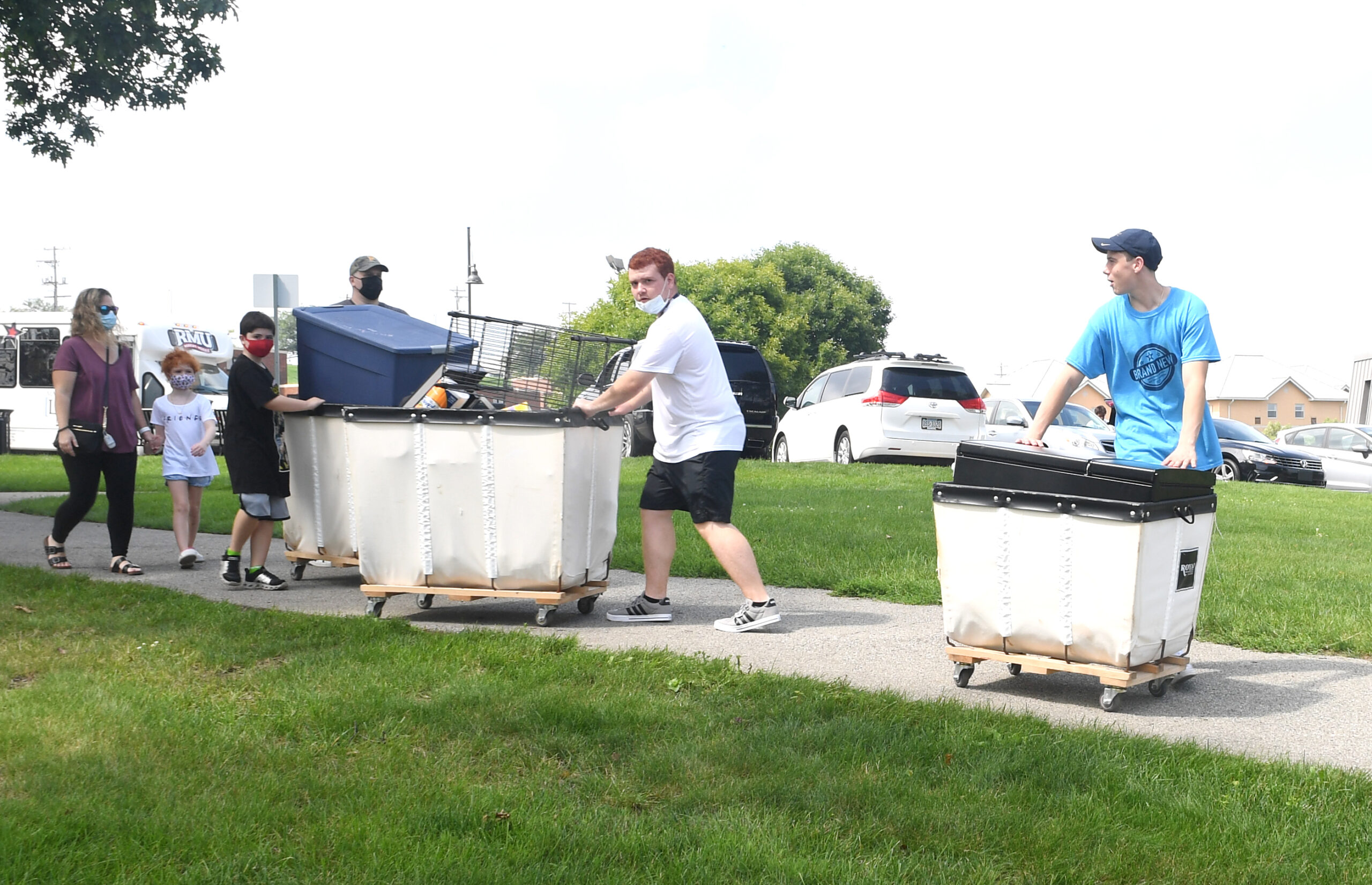 PLEASE WITHHOLD MY BYLINE/CREDIT.) #Standalone. Jackson Catanzaro, right, of Oakmont, and a sophomore at Robert Morris University, assist incoming freshmen Devin McArdle-Larrow, of Lincoln Place, center, moves into the dormitory Thursday, Aug. 26, 2021, at Robert Morris University in Moon. Mr. McArdle-Larrow is also assisted by other family members. (Nate Guidry/Post-Gazette)