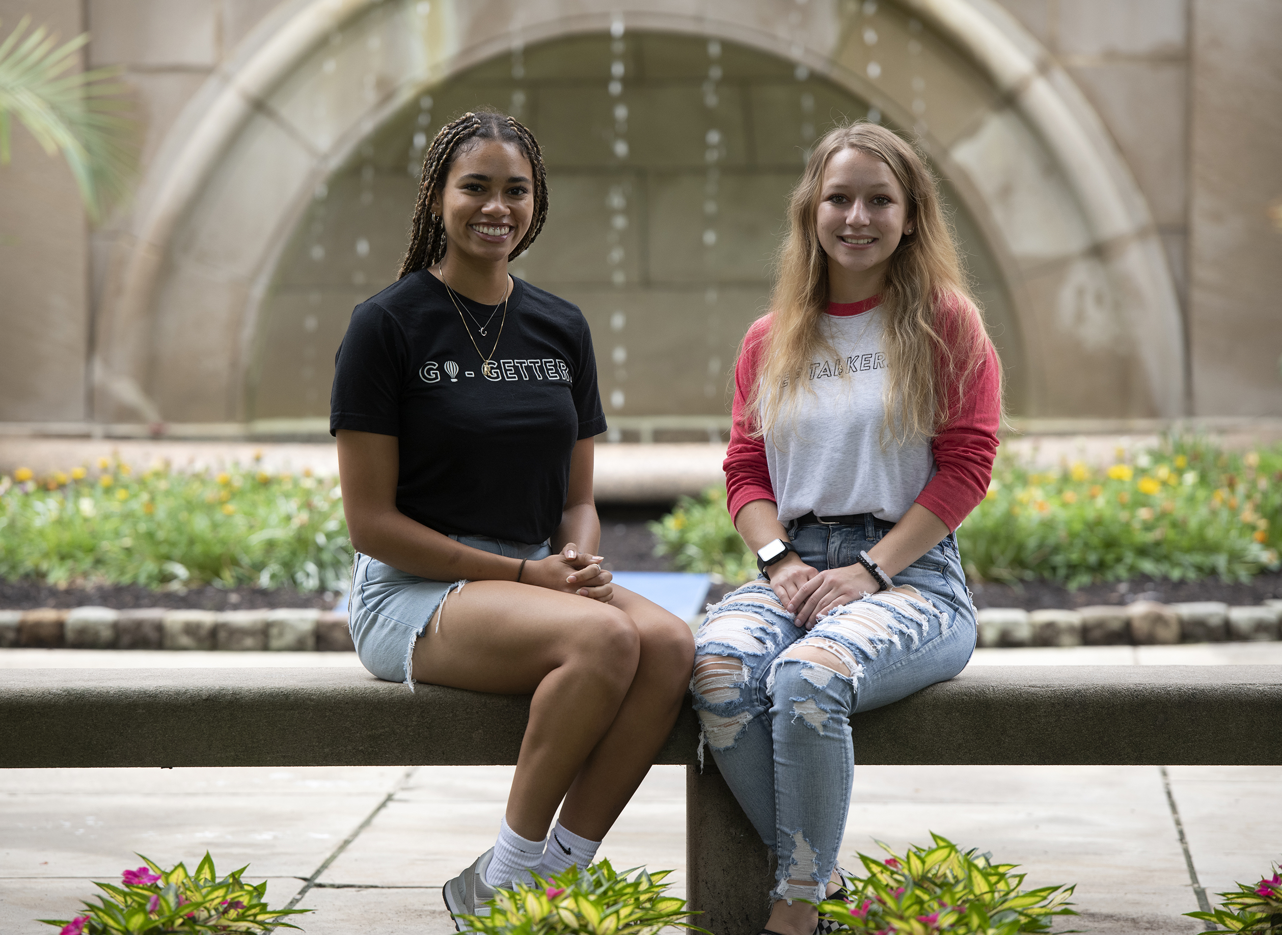 Ceari ìRobbieî Robinson and Angel Albright at the Cathedral of Learning Thursday, Aug. 26, 2021 in Pittsburgh. The two have been chosen as the student CEOs of two new Saxby Cafes on the University of Pittsburgh campus – the Cathedral of Learning and the Hillman Library. (Pam Panchak/Post-Gazette)