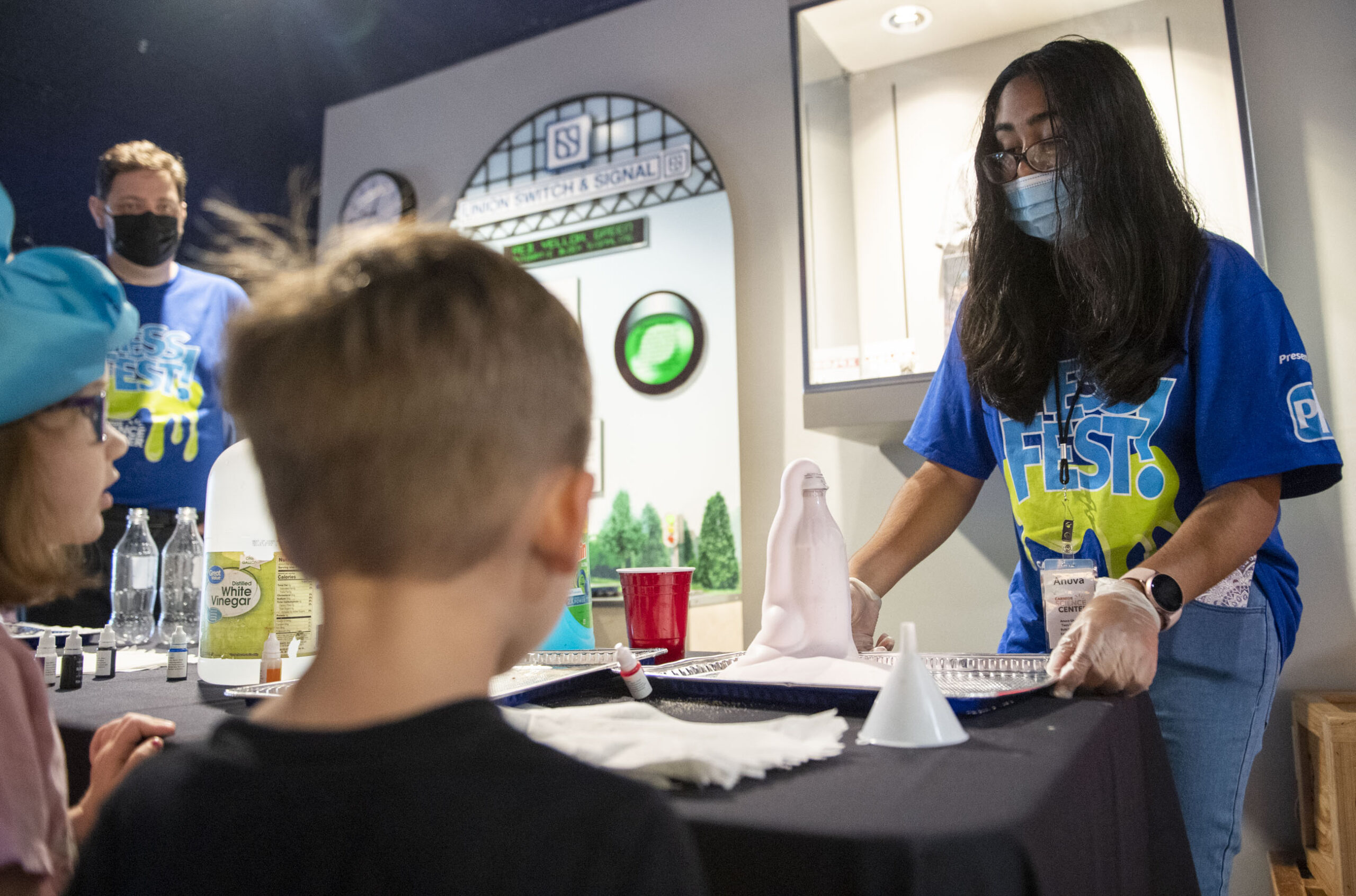 Children watch as Anuva Ghosalkar, a volunteer at the Carnegie Science Center makes “elephant toothpaste” out of hydrogen peroxide, dish soap, white vinegar, and yeast as part of the Carnegie Science Center’s Mess Fest on Sunday, August 22, 2021, at the Science Center on the North Shore. (Emily Matthews/Post-Gazette)