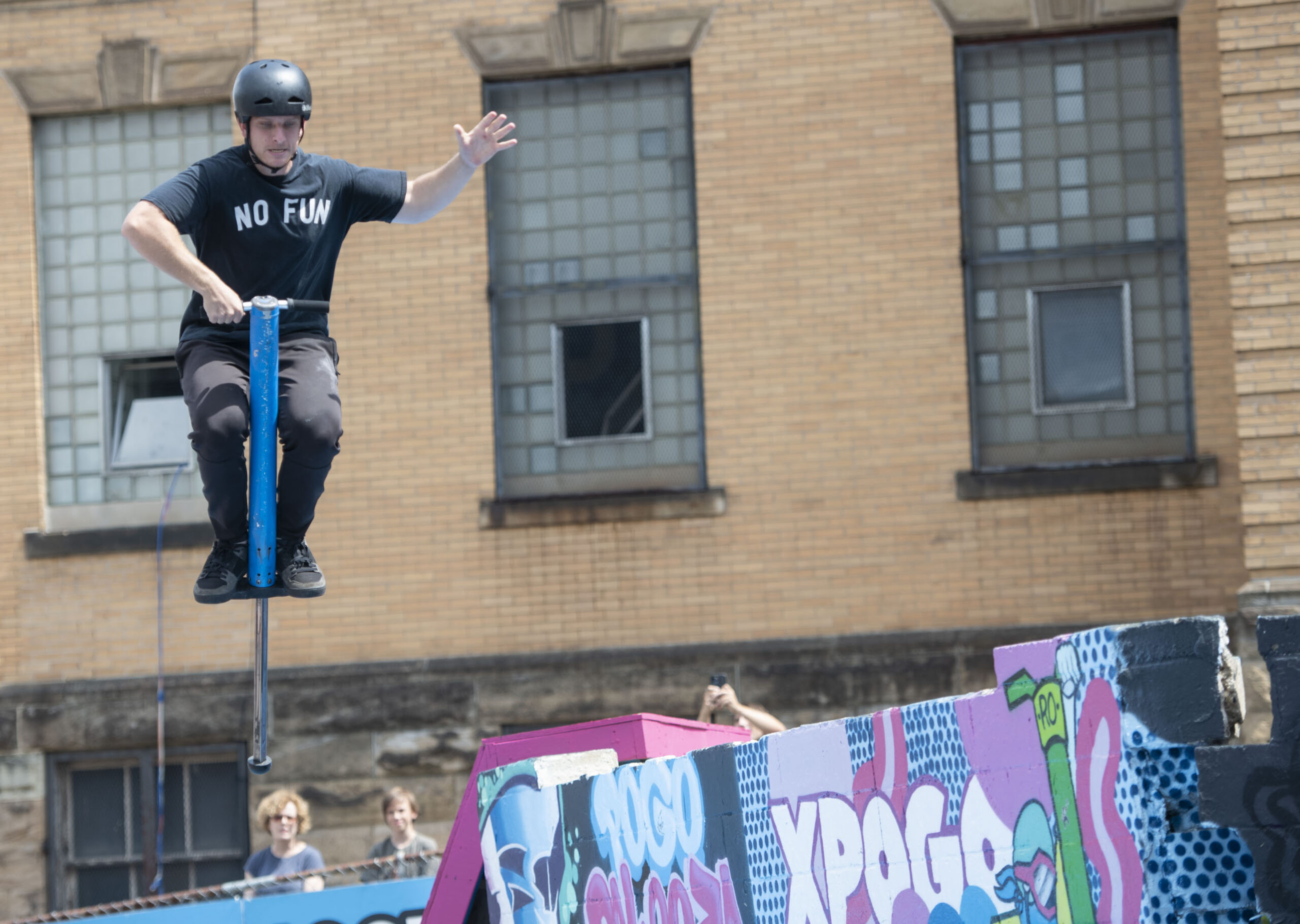 Pro pogo stick athlete Michael Mina, of Colorado Springs, competes in the freestyle finals of Pogopalooza, the Pogo World Championships, on Sunday, August 22, 2021, in Wilkinsburg. (Emily Matthews/Post-Gazette)