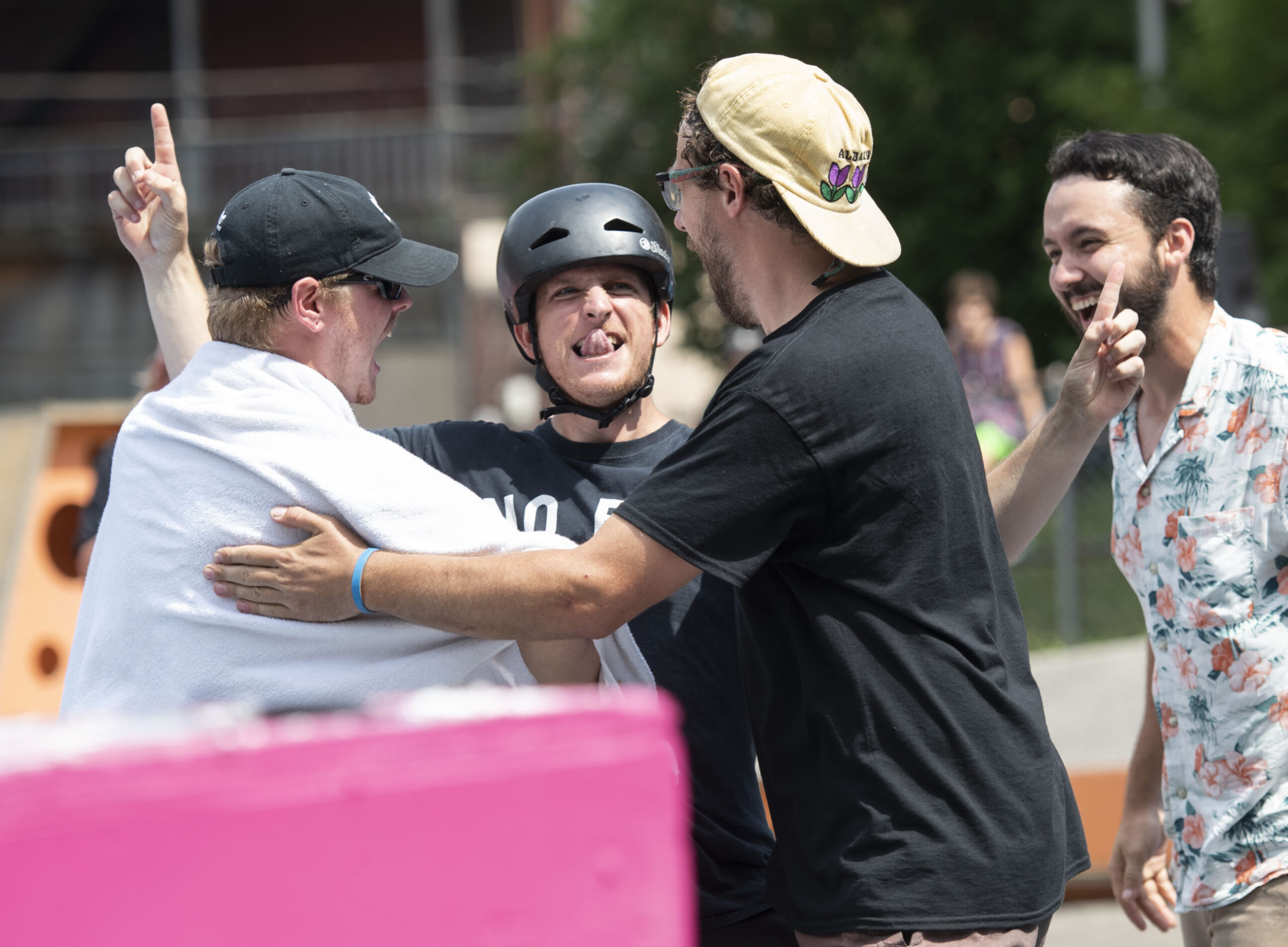 Pro pogo stick athlete Michael Mina, center, of Colorado Springs, celebrates with other pogo stick athletes after competing in the freestyle finals of Pogopalooza, the Pogo World Championships, on Sunday, August 22, 2021, in Wilkinsburg. (Emily Matthews/Post-Gazette)