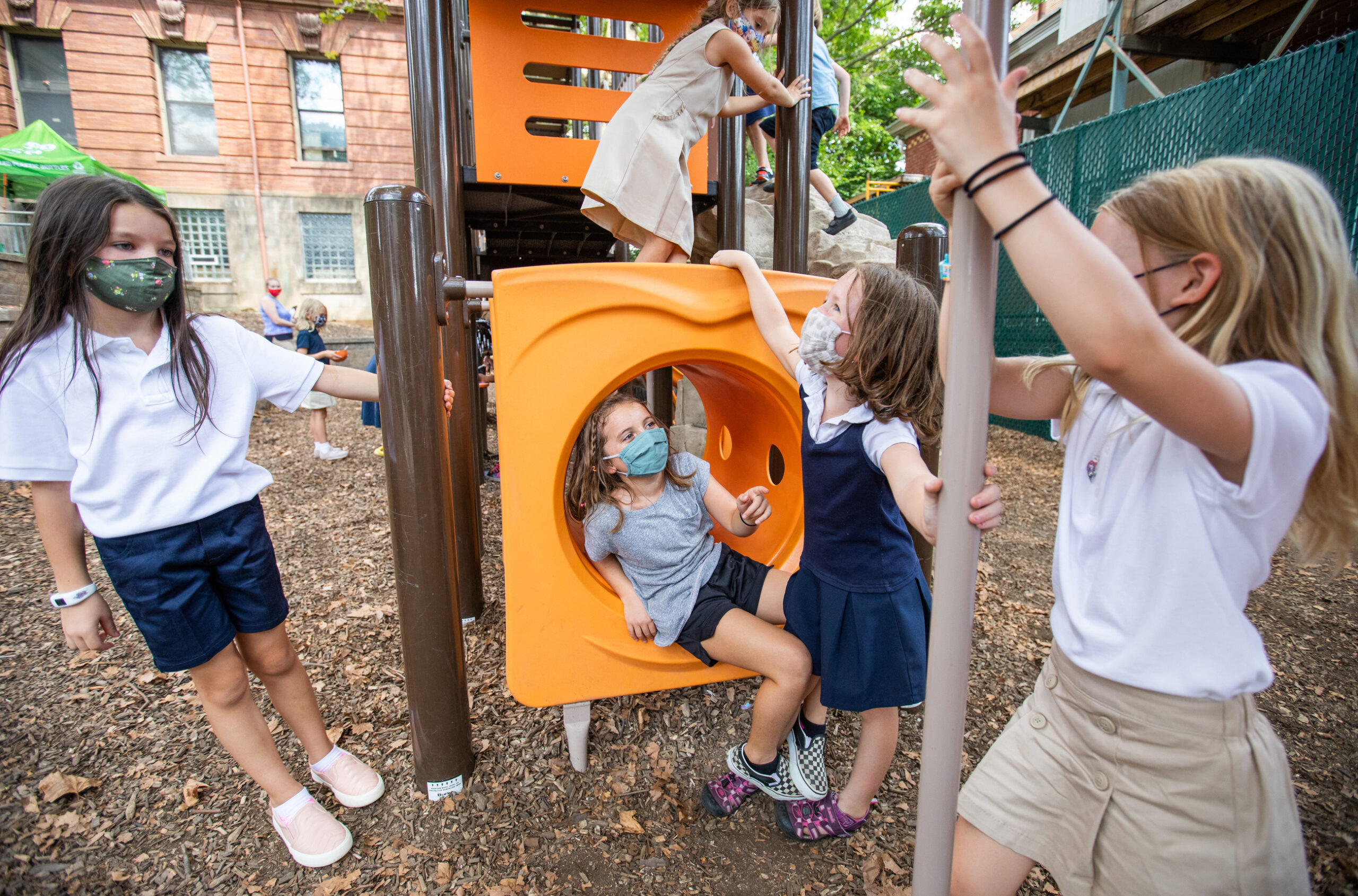 From left, Mollie Mannion, Violet Cataldi, Lennon Abbott, and Nora Gyves, from Geri Rabinowitz’s second grade class, on the playground during recess at Environmental Charter School’s Lower School on Wednesday, Aug. 25, 2021, in Point Breeze. (Andrew Rush/Post-Gazette)