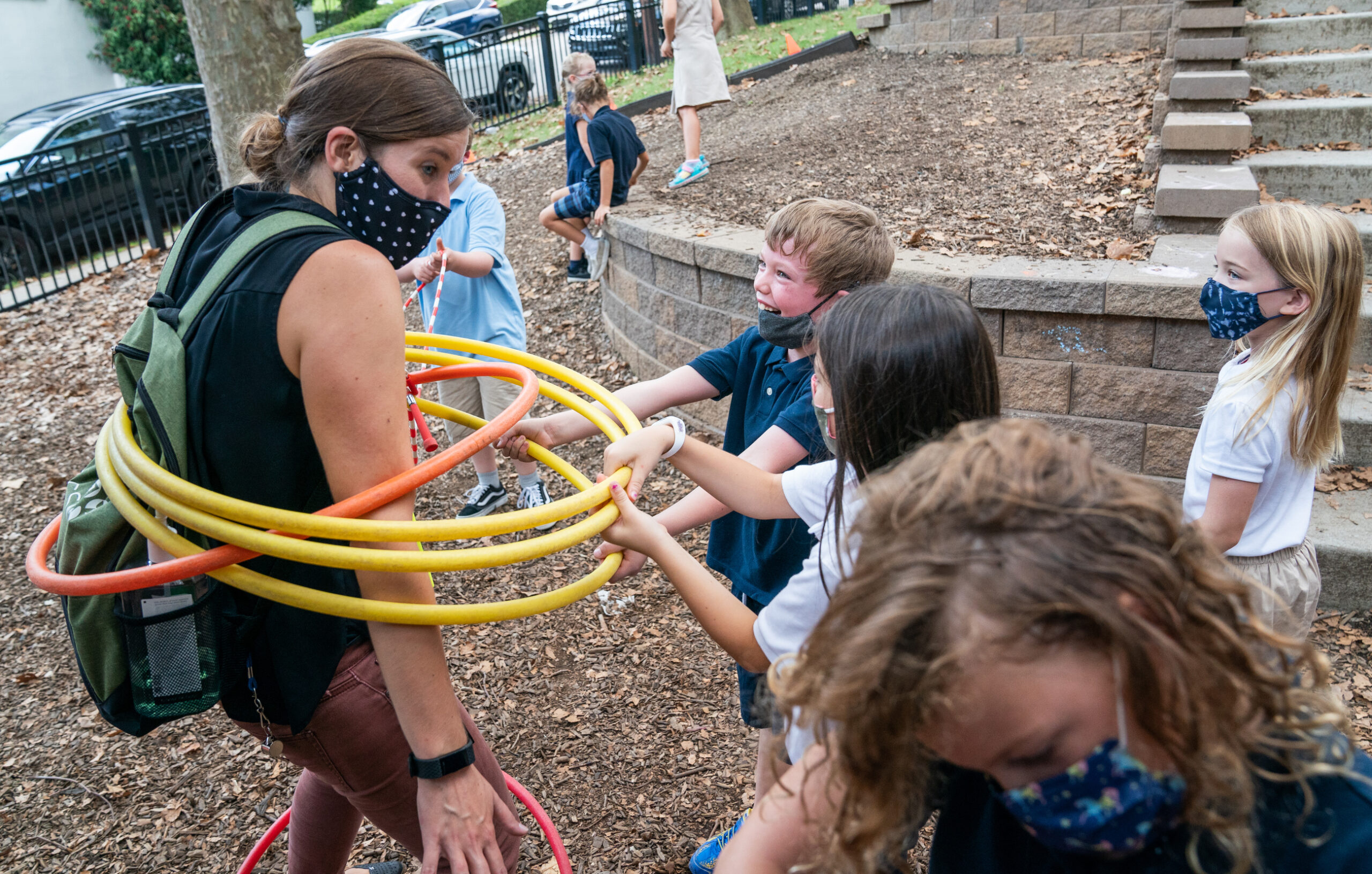Teacher Jess Peterson, plays with students, from left, Henry Bell, Mollie Mannion, Miriam Silva during recess at Environmental Charter School’s Lower School on Wednesday, Aug. 25, 2021, in Point Breeze. (Andrew Rush/Post-Gazette)