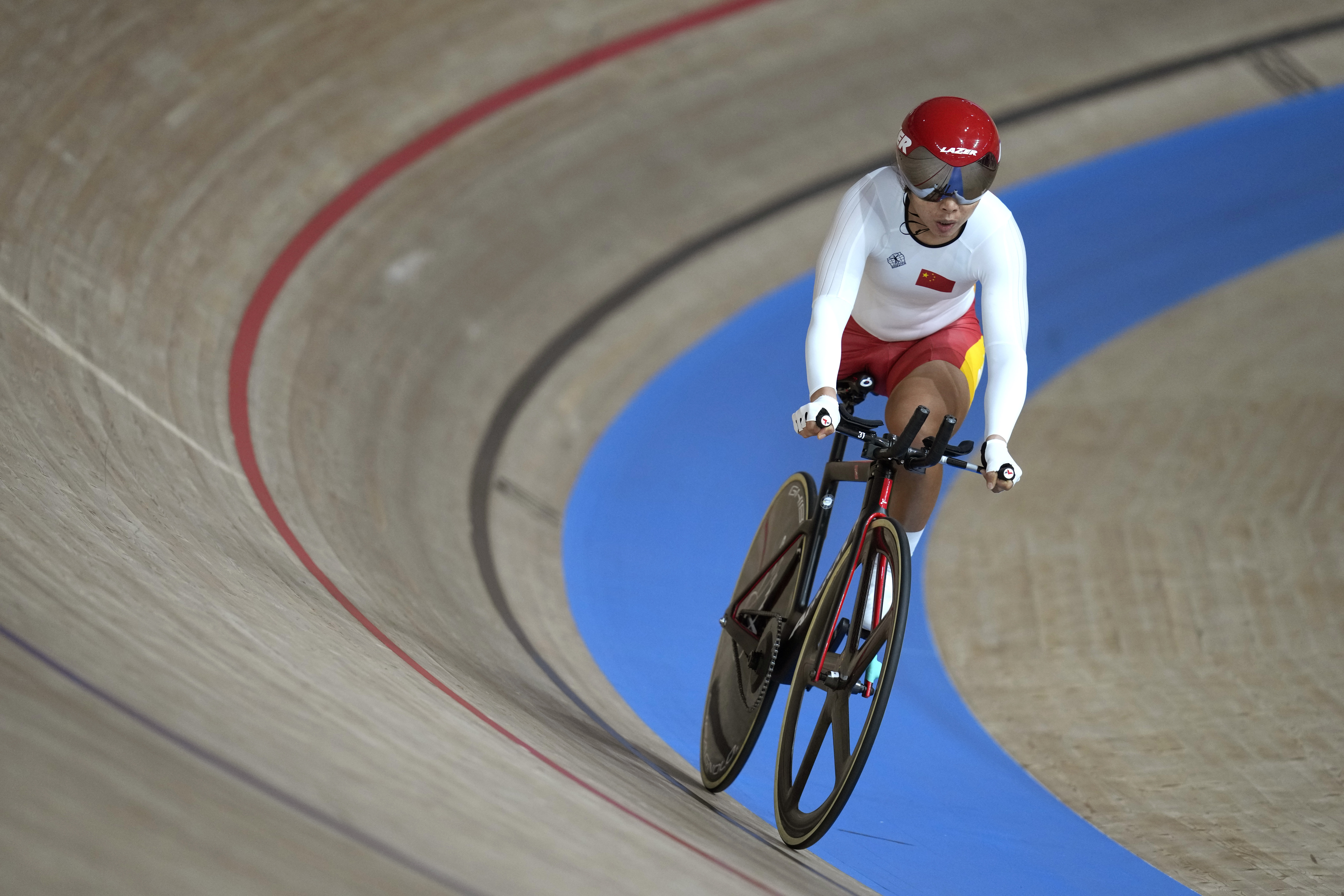 China’s Zeng Sini competes during a heat of the Cycling Track women’s C1-3 3000m Individual Pursuit at the Tokyo 2020 Paralympic Games, Wednesday, Aug. 25, 2021, in Izu, Shizuoka prefecture, Japan. (AP Photo/Shuji Kajiyama)