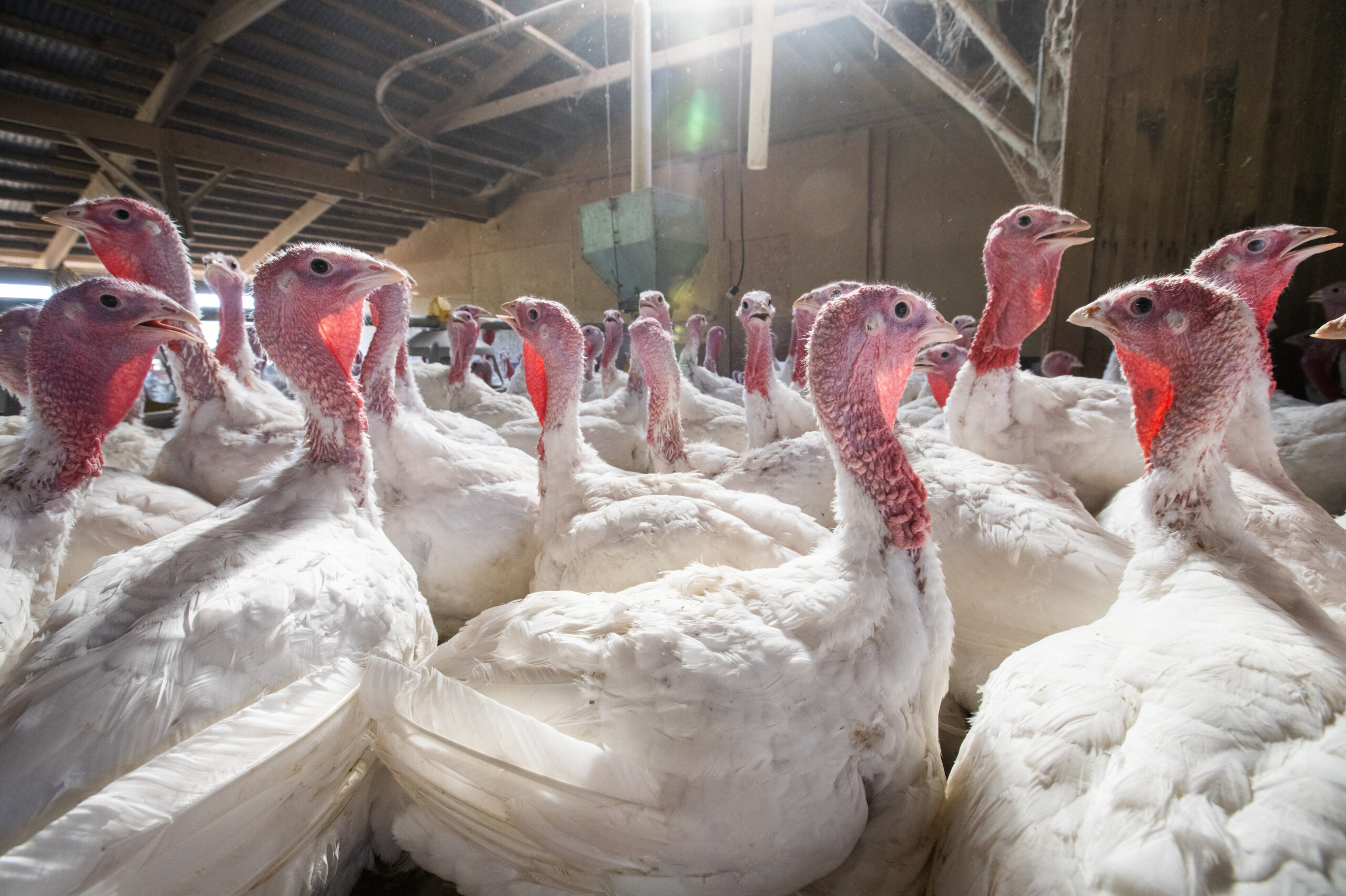 Turkeys in a finishing barn at Pounds’ Turkey Farm on Tuesday, Nov. 9, 2021, in Allegheny Township, Westmoreland County. The farm, run by Rick and Tim Pounds, raised 7000 turkeys this year and all of them are claimed for this Thanksgiving. (Andrew Rush/Post-Gazette)