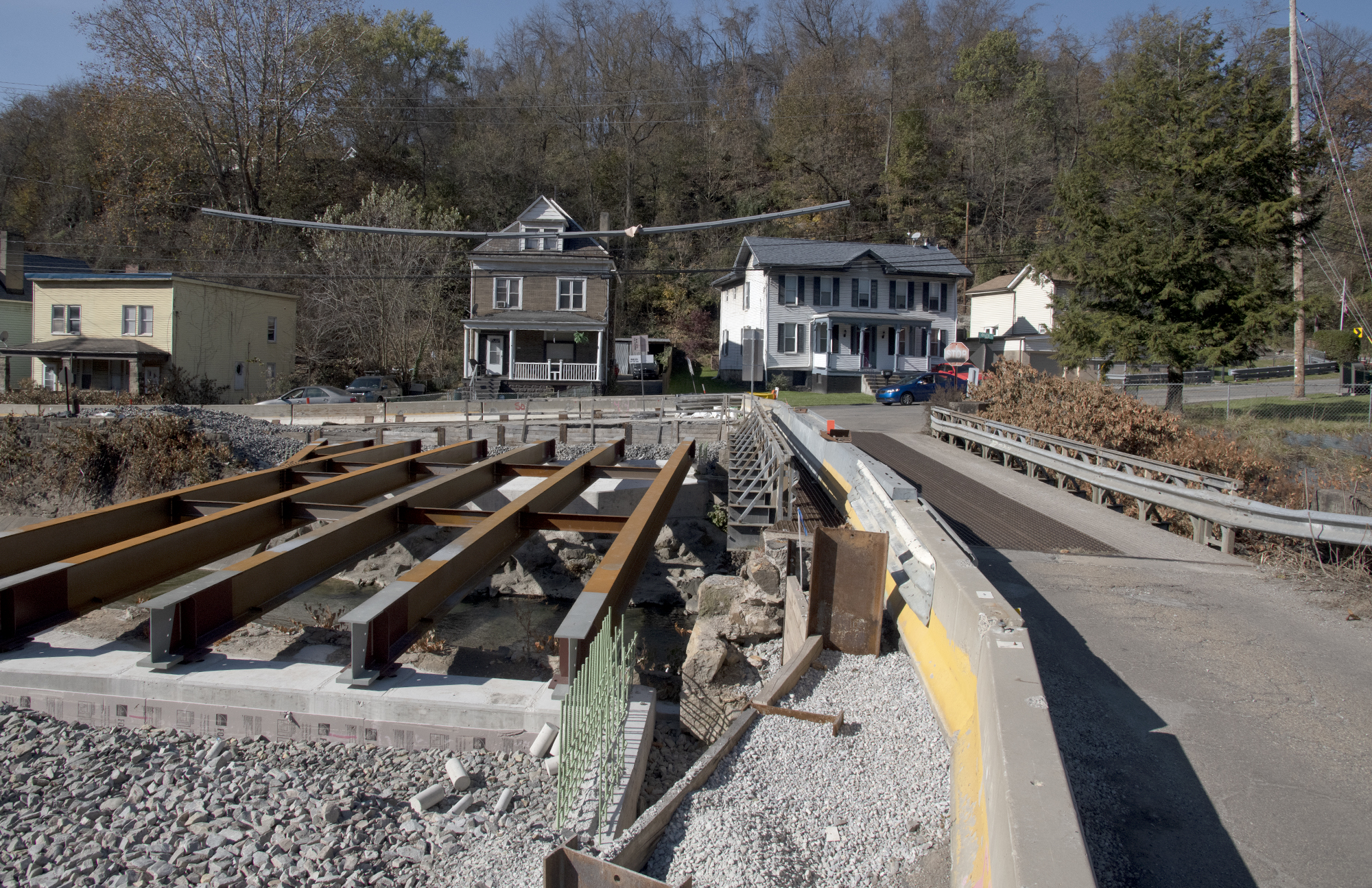Construction on the Thompson Run East Branch Bridge No. 2 which carries Jones Avenue in Wilkins Township and The Turtle Creek Borough is restarting after a delay in the shipment of steel beams Tuesday, Nov 9, 2021 in Turtle Creek. (Pam Panchak/Post-Gazette)