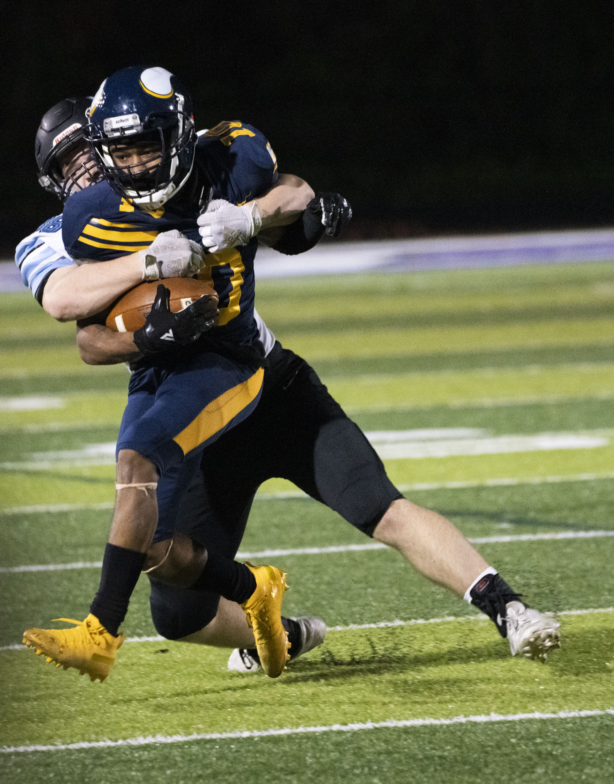 Central Catholic’s Brandon Jackson holds on to the ball as he gets tackled by Seneca Valley’s Wyatt Craver on Friday, Nov. 12, 2021, at Baldwin High School in Whitehall. (Emily Matthews/Post-Gazette)