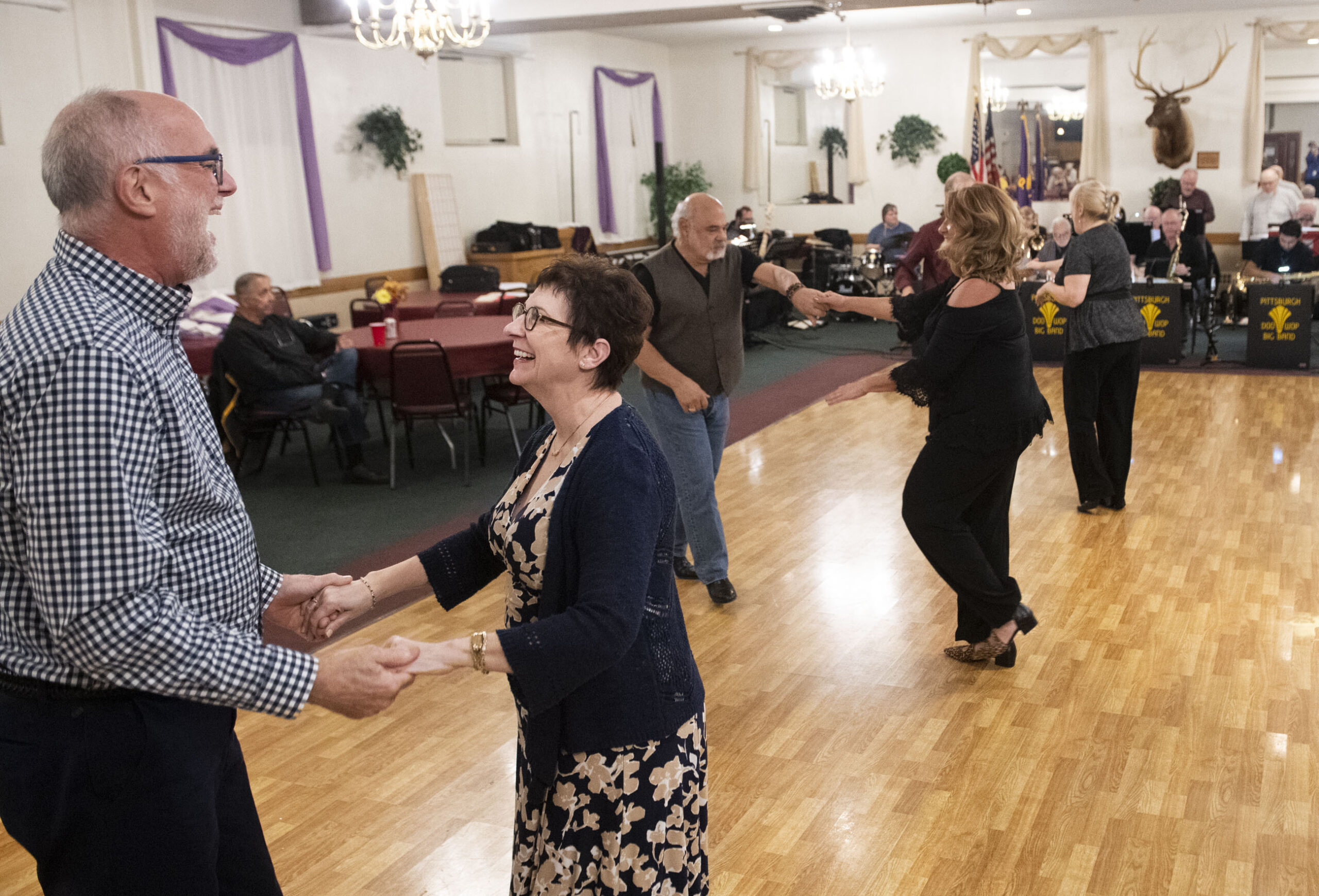 Ernie and Kim Kurtz, of Wilkinsburg, dance along with others to the music of the Pittsburgh Doo Wop Big Band on Tuesday, Nov. 9, 2021, at Oakmont Elks #1668. The Pittsburgh Doo Wop Big Band plays every second and fourth Tuesday of the month. Deb Weible, the drummer in the band and also a member of the Elks club, said she hopes the music brings more people to the club and more attention to the club’s involvement in the community. (Emily Matthews/Post-Gazette)