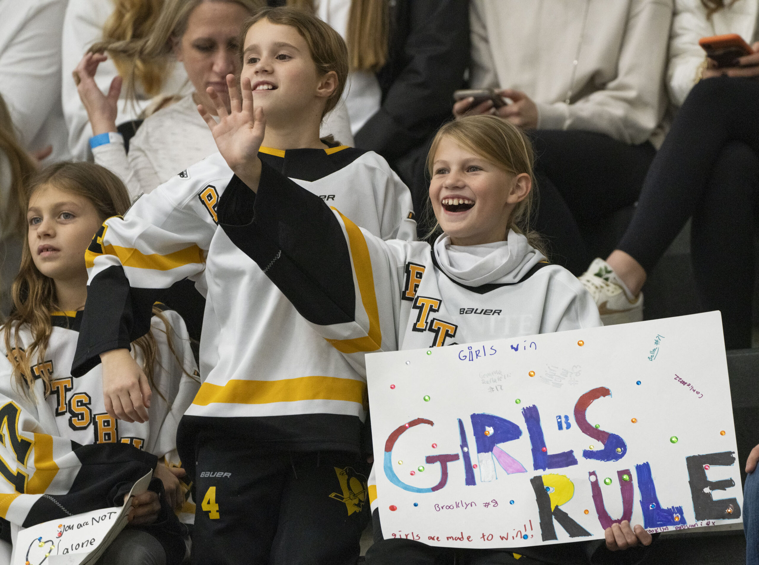 Brooklyn Donovan, 8, right, who plays for the Pens Elite 10U girls team, waves and holds up a sign in support of the female Mars goaltender before the start of Mars’ game against South Fayetee on Monday, Nov. 8, 2021, at UPMC Lemieux Complex in Cranberry. Next to her are her teammates Gemma Scarlatelli, 9, left, and Tess Krotine, 10. (Emily Matthews/Post-Gazette)