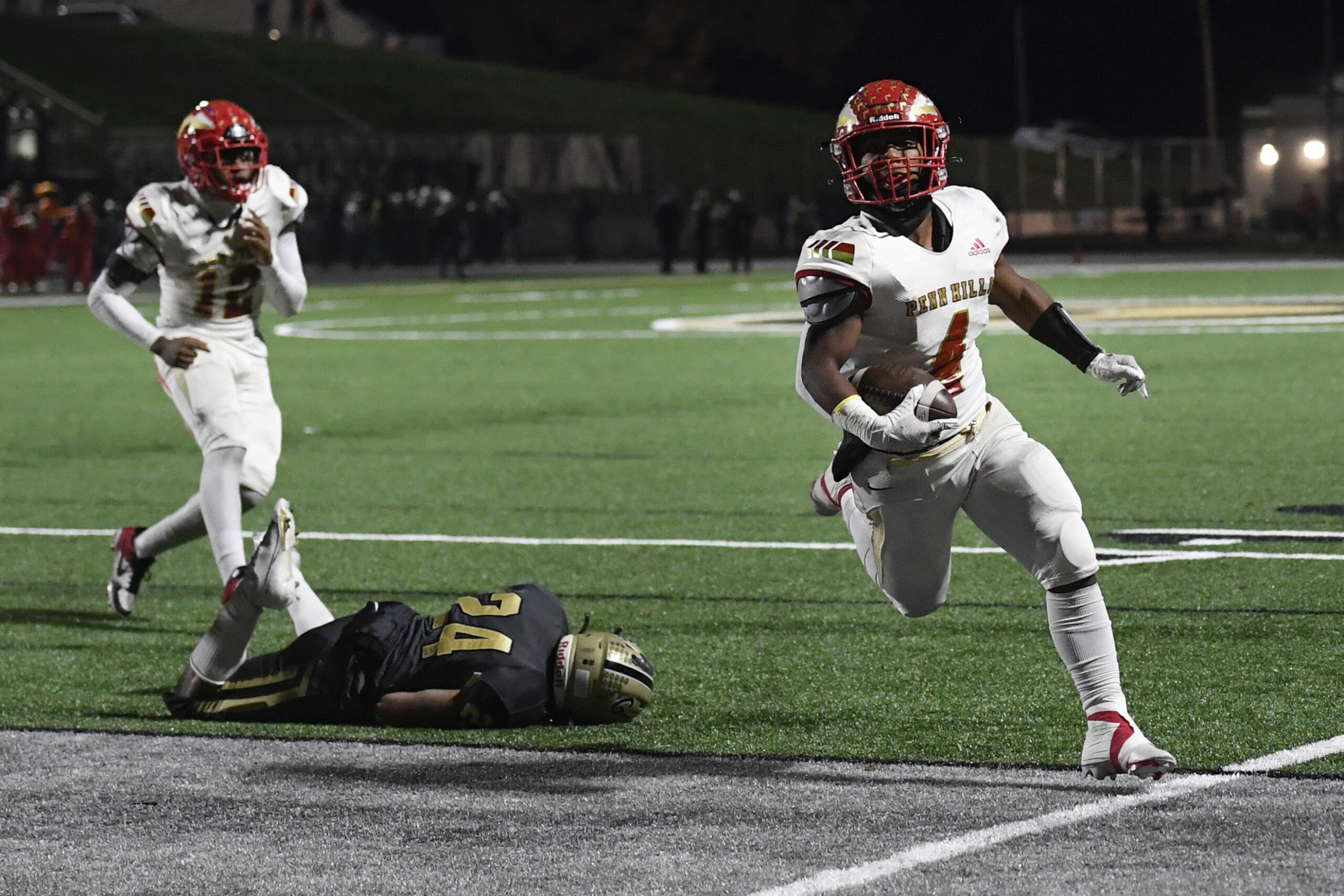 Penn Hills quarterback Amir Key runs past Gateway defender Elijah Heller to score a fourth quarter touchdown during their WPIAL Class 5A quarterfinal playoff game on Friday, Nov. 12, 2021, at Gateway High School in Monroeville. Penn Hills defeated Gateway 23-20. (Barry Reeger/For the Post-Gazette)