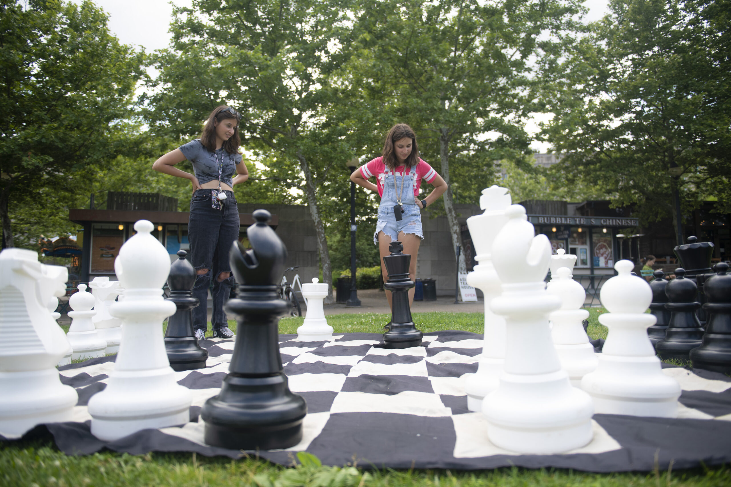 Ally Lichwala, 12, right, and Angie Lichwala play chess together during lunch at Schenley Plaza on Tuesday, June 14, 2022, in Oakland. They spent the day at the Carnegie Museum of Natural History for their free teen membership day. (Maya Giron/Post-Gazette)