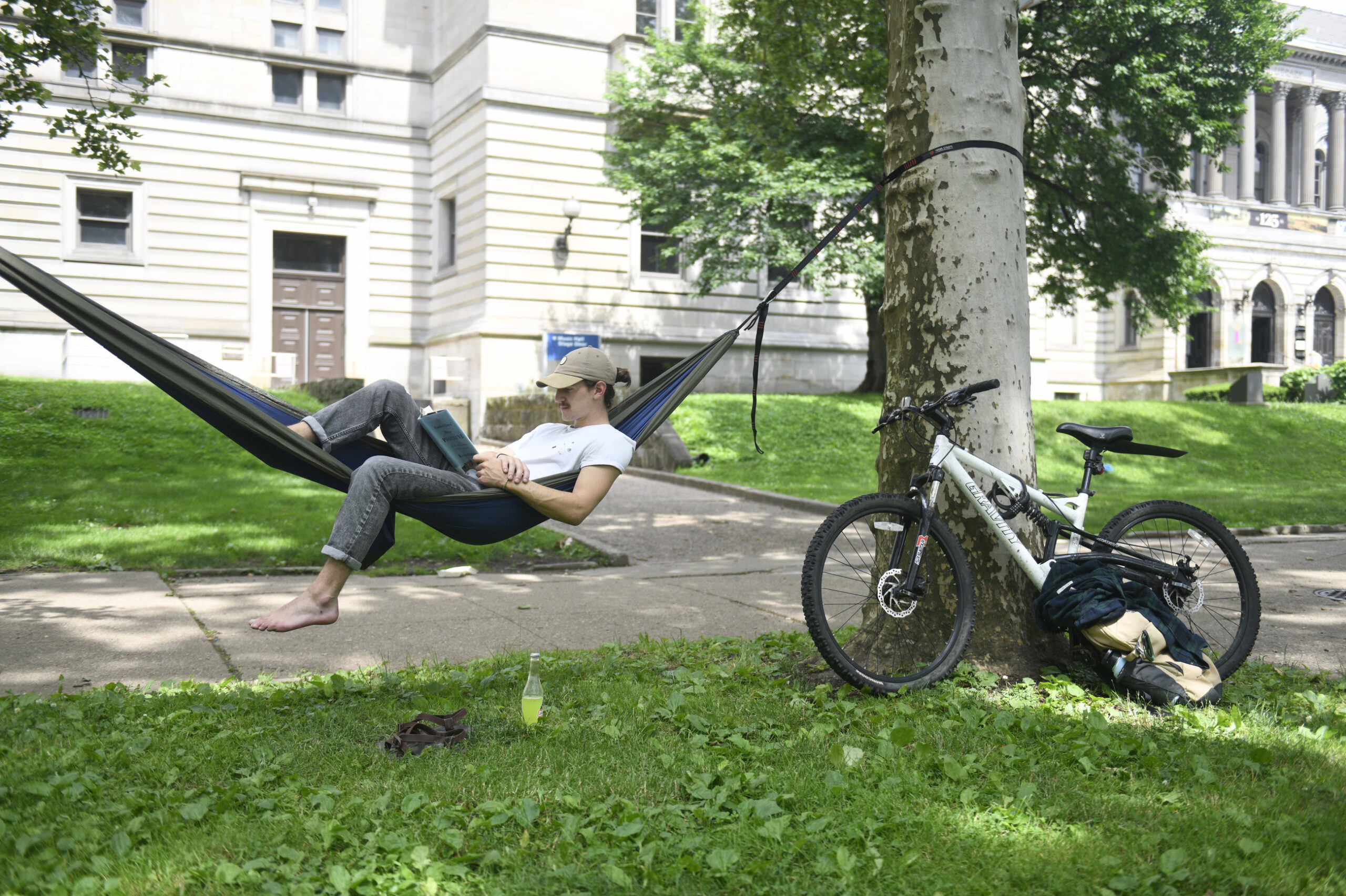 Stand Alone June 15, 2022 • 2560 × 1705 • Week in Photos: June 12-18, 2022 Owen Shaffer, 22, of Upper Hills, relaxes on his hammock outside of the Carnegie Library of Pittsburgh on Tuesday, June 14, 2022, in Oakland. He came out to read his book “The Hundred Years’ War on Palestine.” (Maya Giron/Post-Gazette)