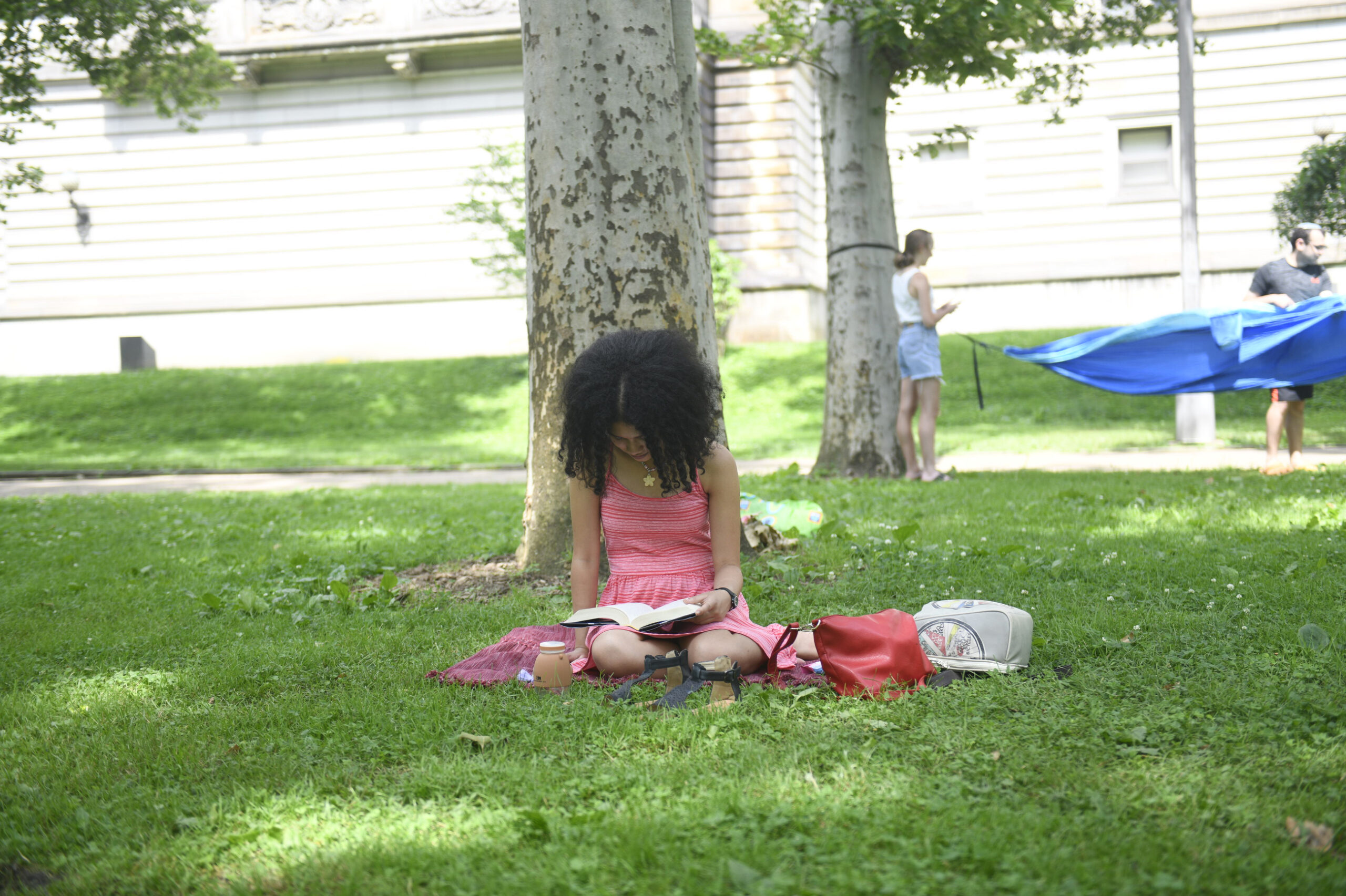 Lauren Benn, 23, of New Jersey, relaxes outside of Carnegie Library of Pittsburgh on Tuesday, June 14, 2022, in Oakland. “Whenever I have a day off, I only work a few days a week,” says Lauren. “I just sit here with one of my books and enjoy the fresh air.” She was reading “The Nobleman’s Guide to Scandal and Shipwrecks”. (Maya Giron/Post-Gazette)