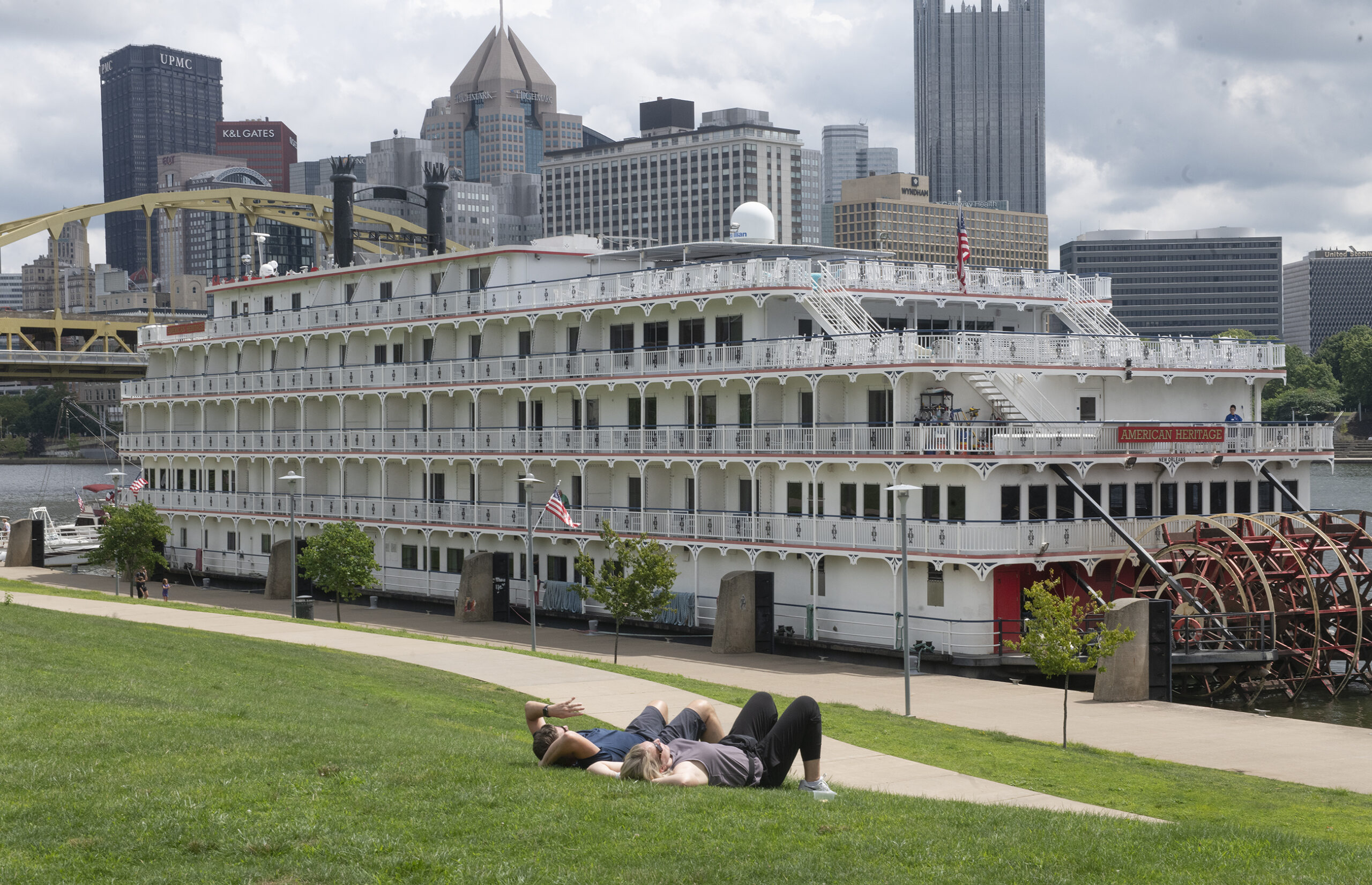 PLEASE WITHHOLD MY BYLINE/CREDIT.) #Standalone. Jim and Jessica Kilmartin, of Altoona, take in a little sun and check out the American Heritage that is docked in the Allegheny River Monday, Aug. 15, 2022, on the North Shore. The couple said they were spending time on the North Shore before heading to the airport for a trip to the Caribbean. (Nate Guidry/Post-Gazette)