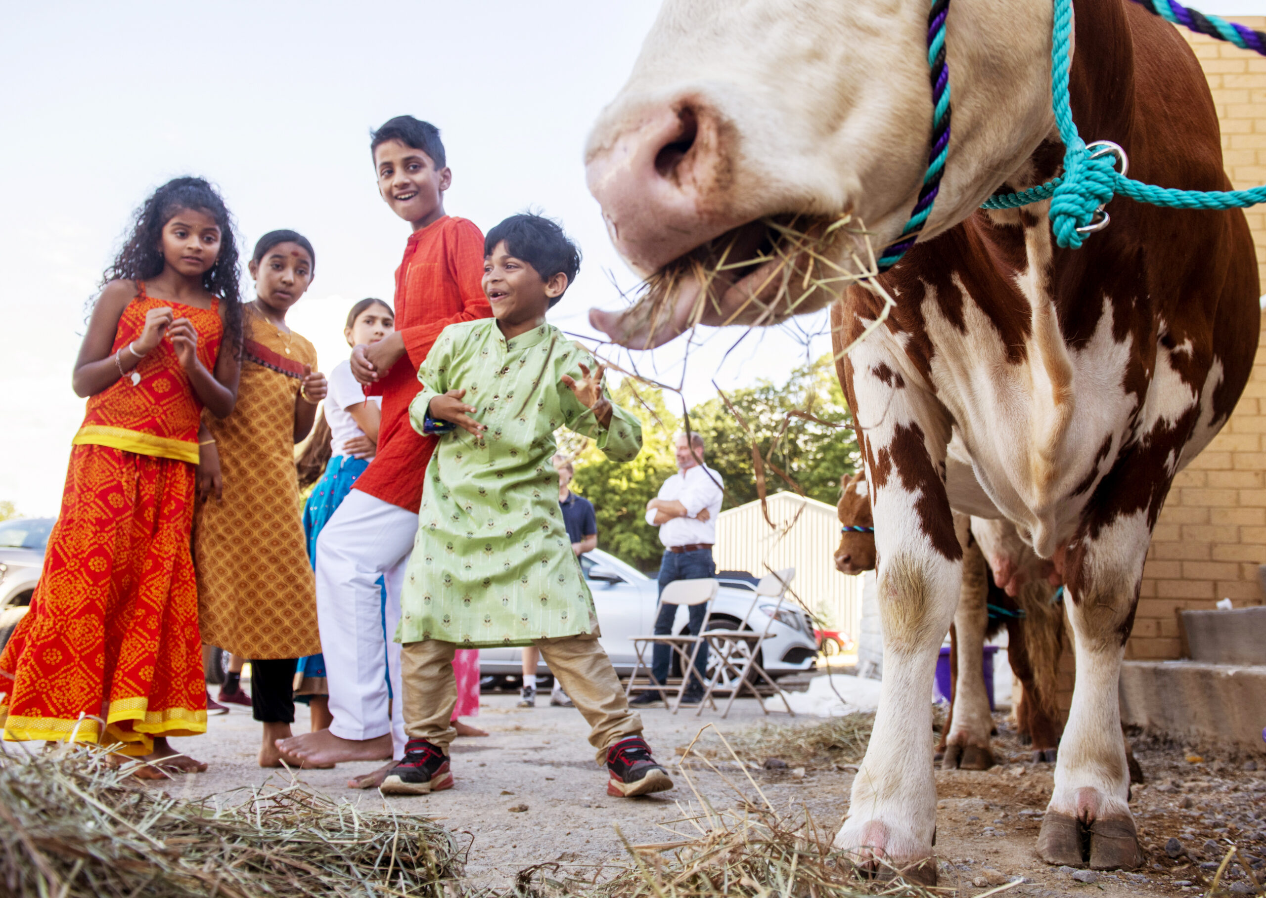 From left: Reva Mendon (CQ), 9, of Mars, Shruti Visveish (CQ), 9, of Gibsonia, Aarav Mendon (CQ), 11, of Mars, and Satwik Atmuri (CQ), 6, of Wexford, react as Abilene the cow swings around to greet them Wednesday, Aug. 17, 2022, during the opening festivities for Chinmaya Amarnath (CQ), a new Hindu temple and community center in Mars. Abilene and her 3-month-old calf, Alamo, were brought to the temple from Tunnel Hill Farm in Leechburg to be involved in the procession and opening ceremonies. (Morgan Timms/Post-Gazette)