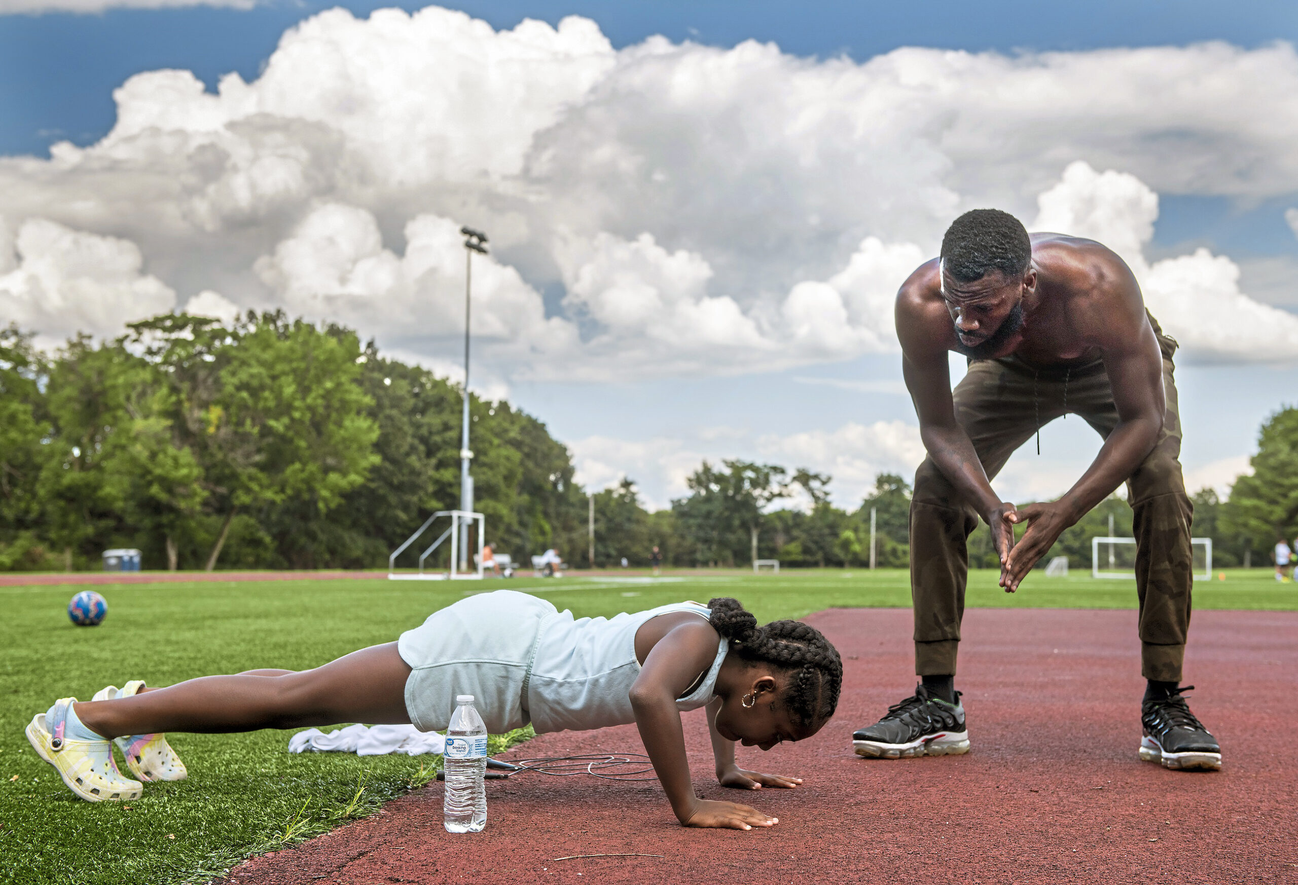 Majorette dancer Aniya Hamm, 11, of Homewood, is coached by her dad, Mica Dawkins of Homewood, Wednesday, Aug. 17, 2022, at the Schenley Oval Sportsplex in Oakland. ÒStay focused,Ó Dawkins said between sets of push ups and star jumps. ÒMind over matter.Ó Hamm decided to train alongside her dad in preparation for her start at the Pittsburgh Creative and Performing Arts magnet school, where she will be continuing her passion for dance on August 29. (Morgan Timms/Post-Gazette)