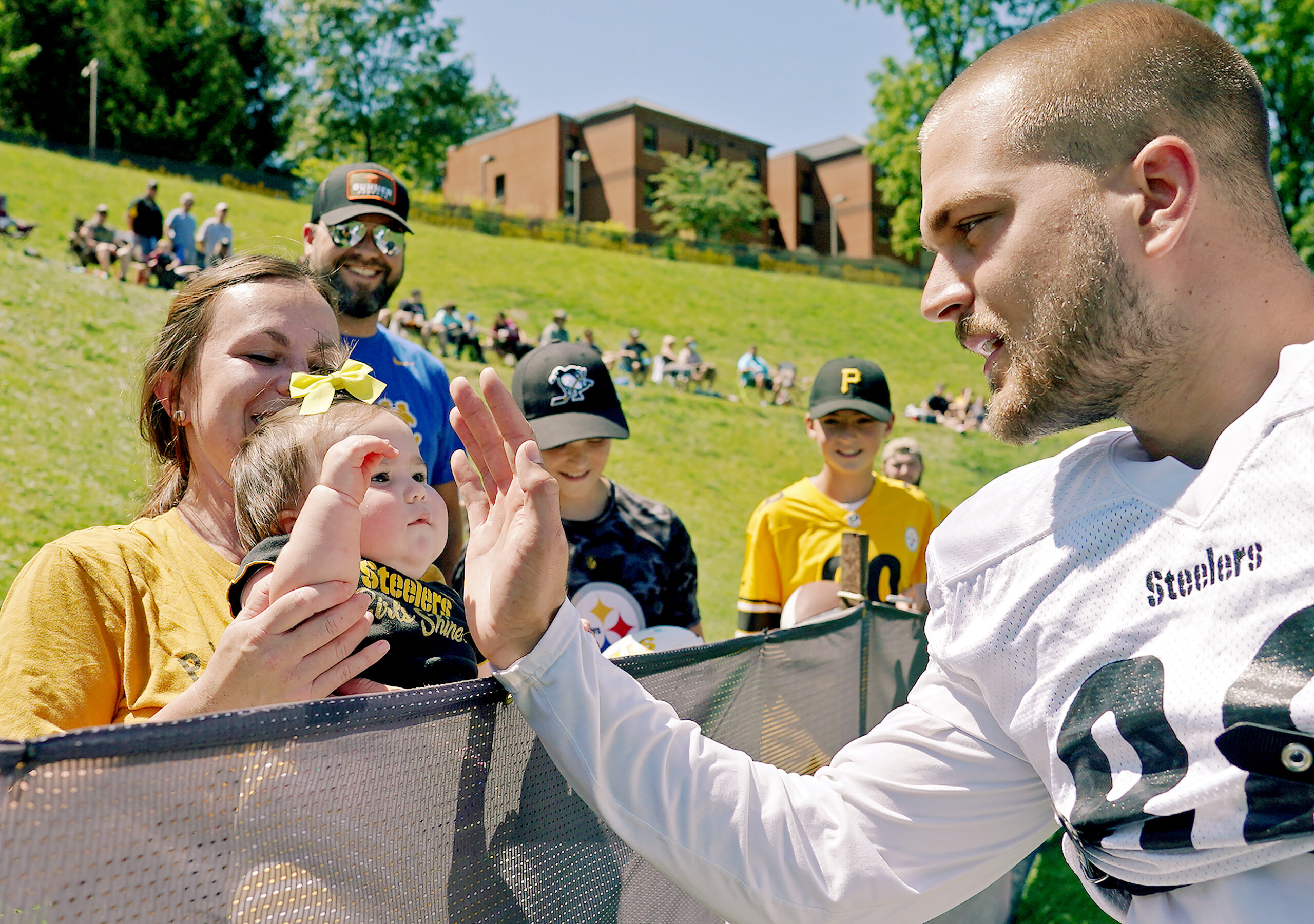 20220818mfsteelerssports07cc August 18, 2022 • 2560 × 1801 • Week in photos: Aug.14-20, 2022 Steelers tight end Pat Freiermuth reaches to give a high five to Ella Kolod, 10 months, of Fairfax, VA, as her mother, Laura, holds her during training camp, Thursday, Aug. 18, 2022, at Saint Vincent College. (Matt Freed/Post-Gazette)